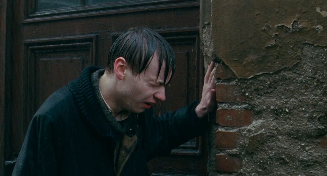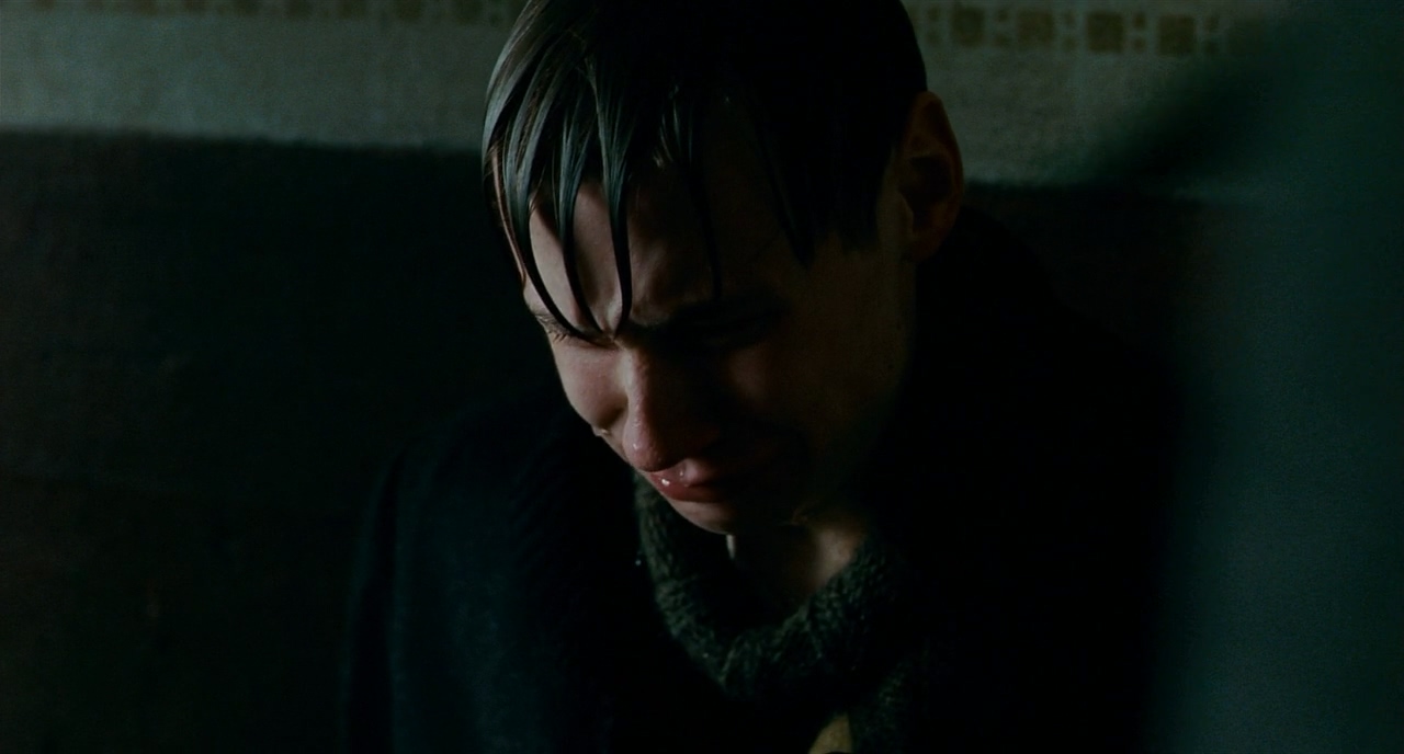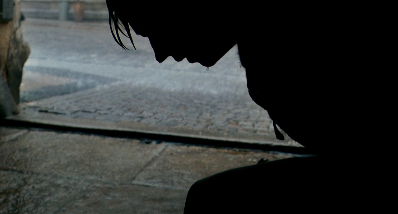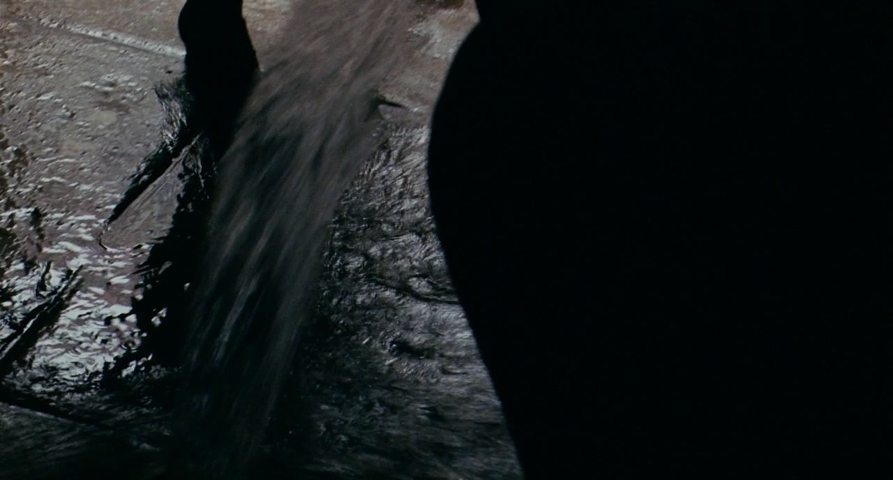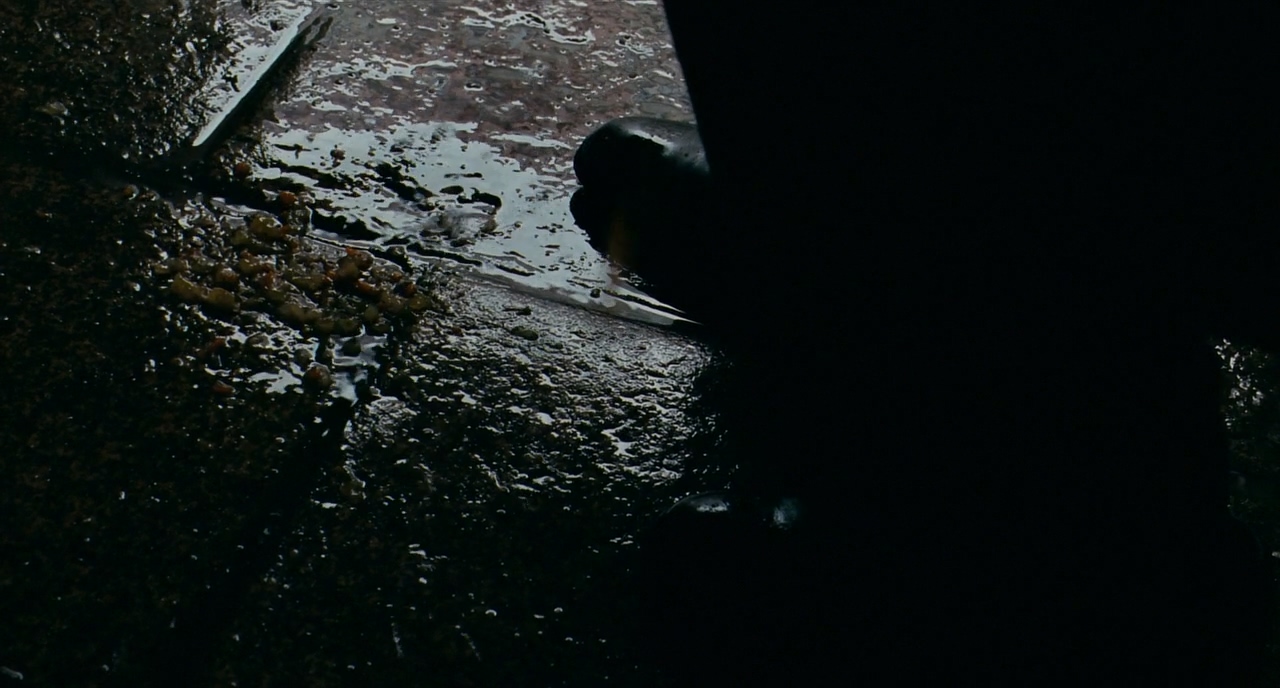 타이트샷으로 들어가니 카메라의 움직임이 더 잘 보이기 시작한다. 타이트한 샷에서도 배경과의 큰 노출 차이를 활용해 인물을 완전히 노출적으로 죽여버리는 방향을 선택했다. 그래서 떨어지는 구토나 작은 빗방울이 눈에 띈다.