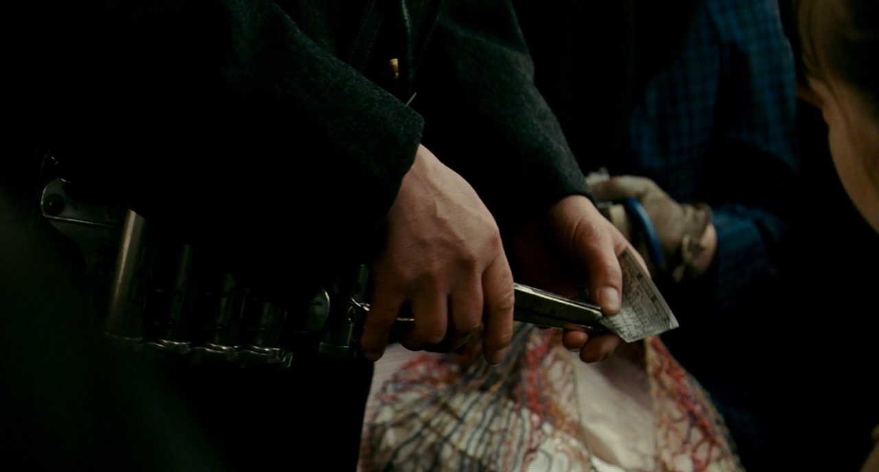 열차 안으로 CUT TO. 검표원의 손에서부터 시작해서 천천히 틸트 업 한다. 차체가 격하게 흔들리고 있는 것처럼 보인다.