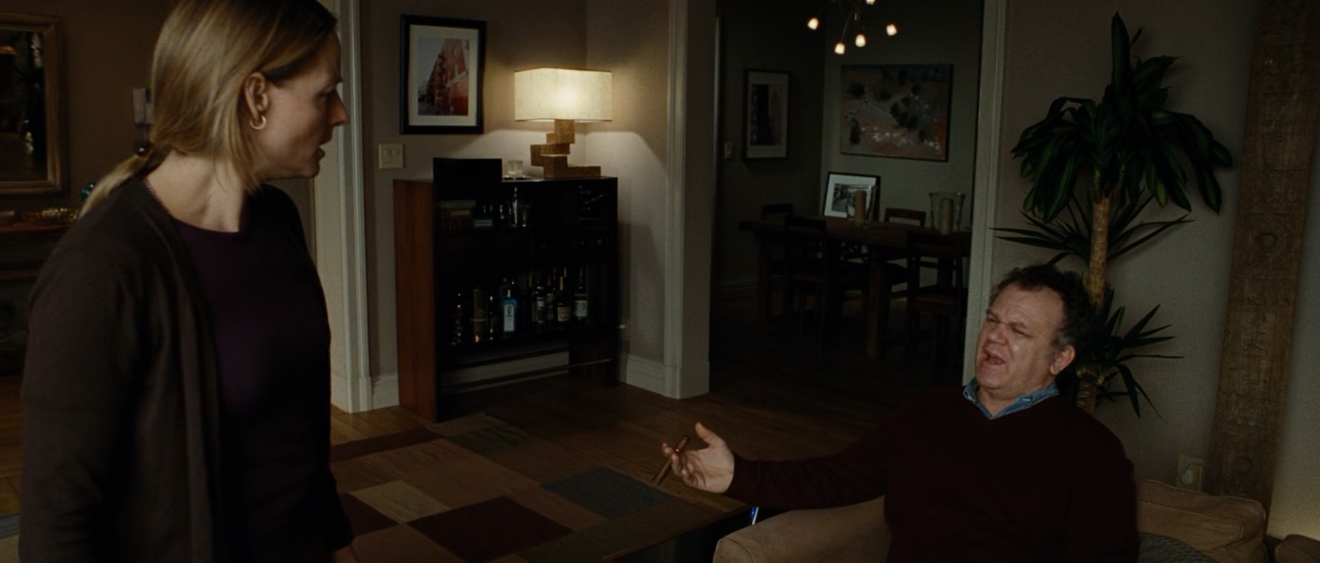 이전 투샷이나 단독에서부터 이미 눈치챌 수 있지만, 이 영화는 전체적으로 광각렌즈로 촬영되었다. 뒷배경까지 보여주는 깊은 심도, 상황과 감정을 더 극적이게 만들어주는 넓은 앵글... 개인적으로 좁고 가득 찬 공간일수록 광각렌즈가 빛을 발한다고 생각하는데, 이 영화가 적절하게 보여준다. 뒤에 있는 인물, 과거에 등장했던 소품들이 배경에 고스란히 쌓여져 있는 것이 보이며 영화를 더욱 재미있게 만들어준다. 어떤 인물에, 어떤 곳에 시선을 두어도 흥미롭다.