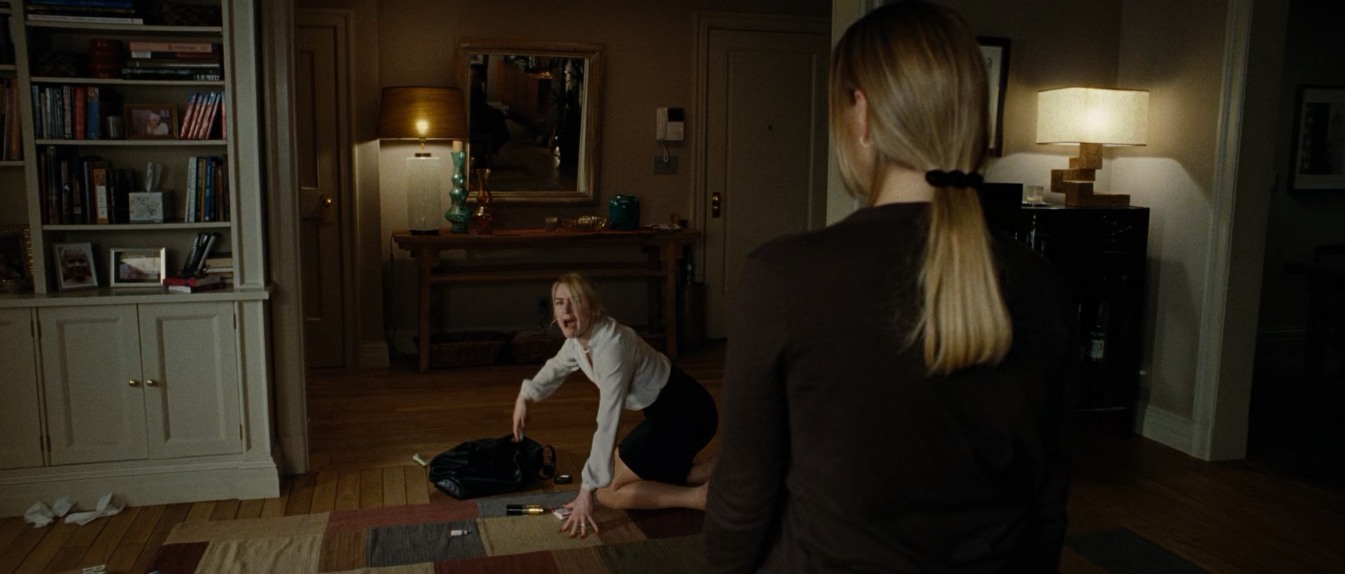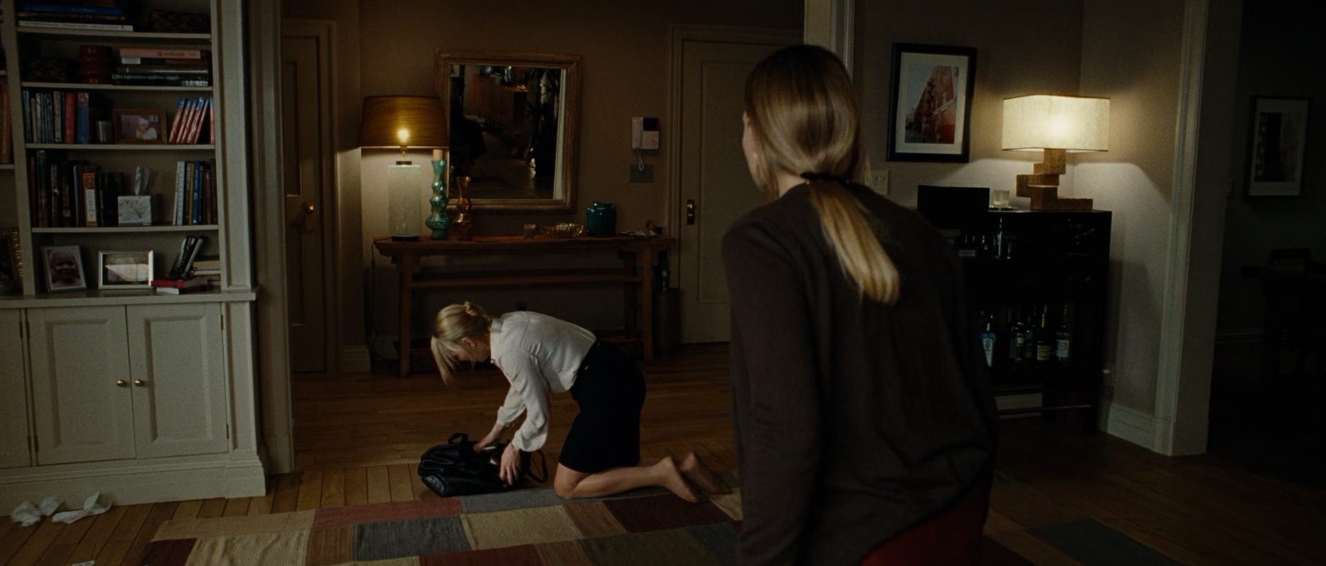 그리고 다음 컷은 위에서 떨어지는 가방에서부터 붙는다. 보통의 영화라면 떨어지는 물건들을 C.U으로 촬영하지 않았을까. 그러나 넓은 샷으로 훨씬 더 재미있는 샷이 되었다. 가만히 있는 인물들 위에서 소지품이 와르르 떨어지고 가장 멀리 있던 낸시가 앞으로 달려나오는게 최소한의 카메라 움직임으로 입체적인 장면을 만들어냈다고 생각한다.