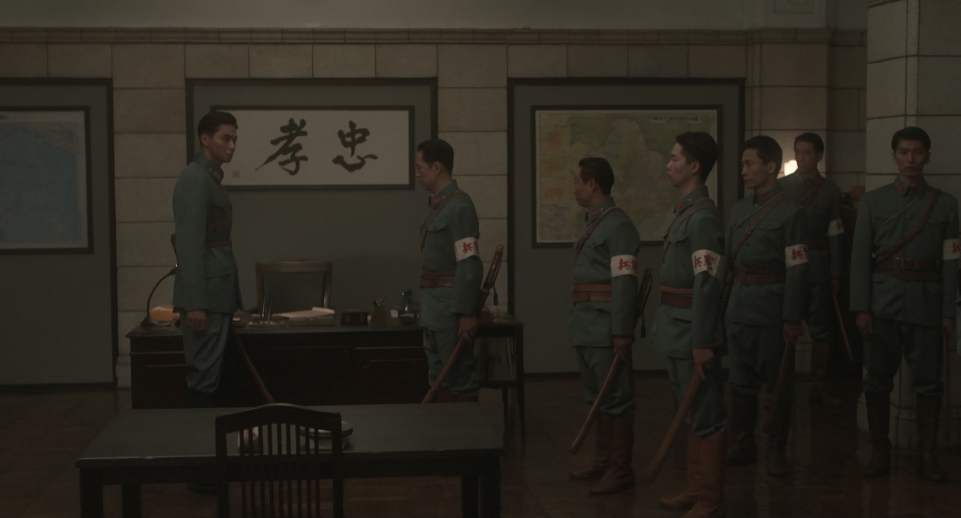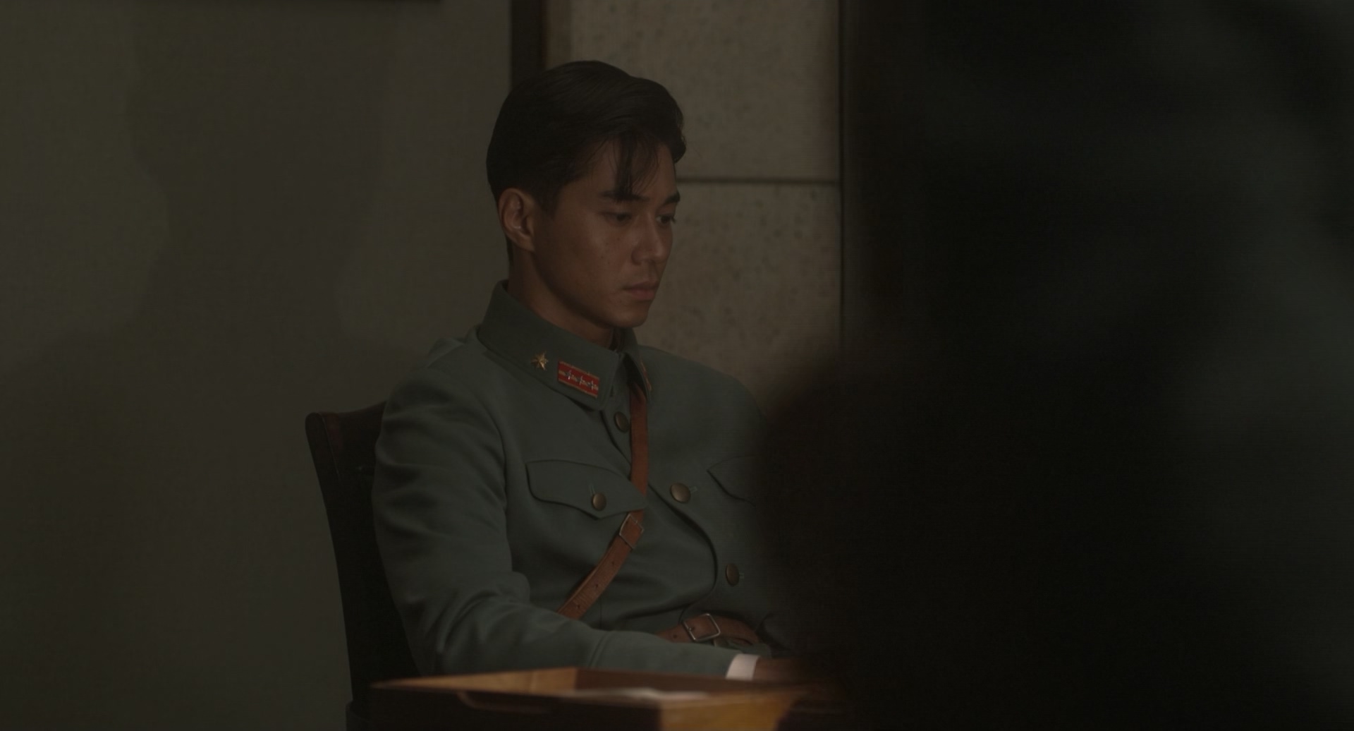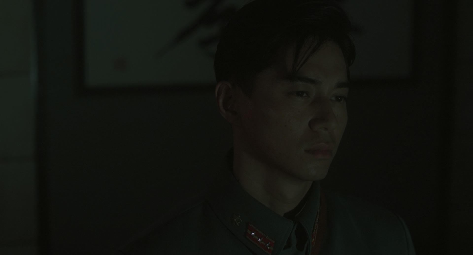 이 샷은 단독샷 치고는 넓게 촬영되어 헤드룸도 넓은데, 인물의 앞에 라이트를 가깝게 배치하여 뒤에 커다란 그림자가 생기는게 재밌다. 그리고 타이지의 좌우로 헌병대를 배치하였다.