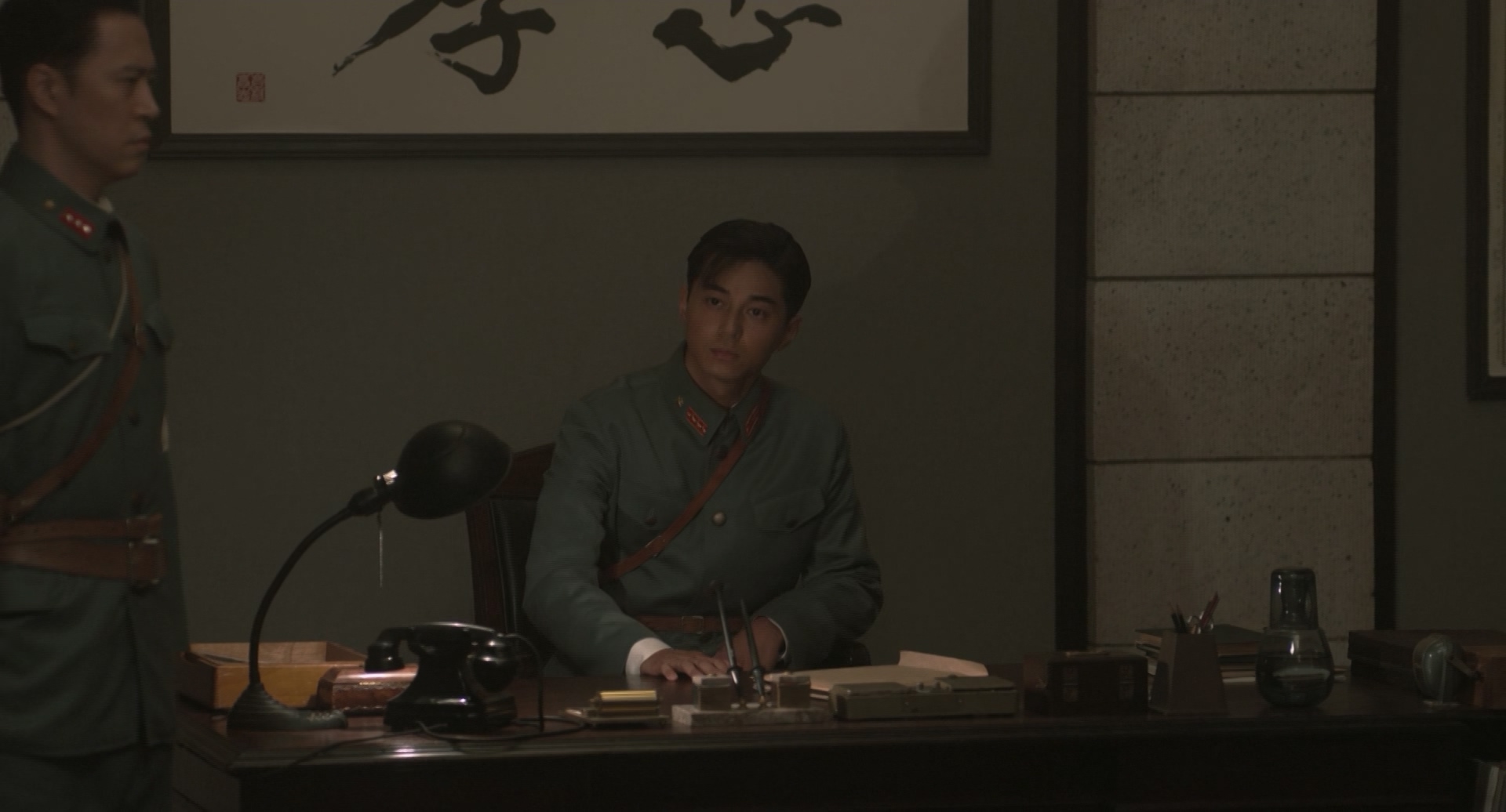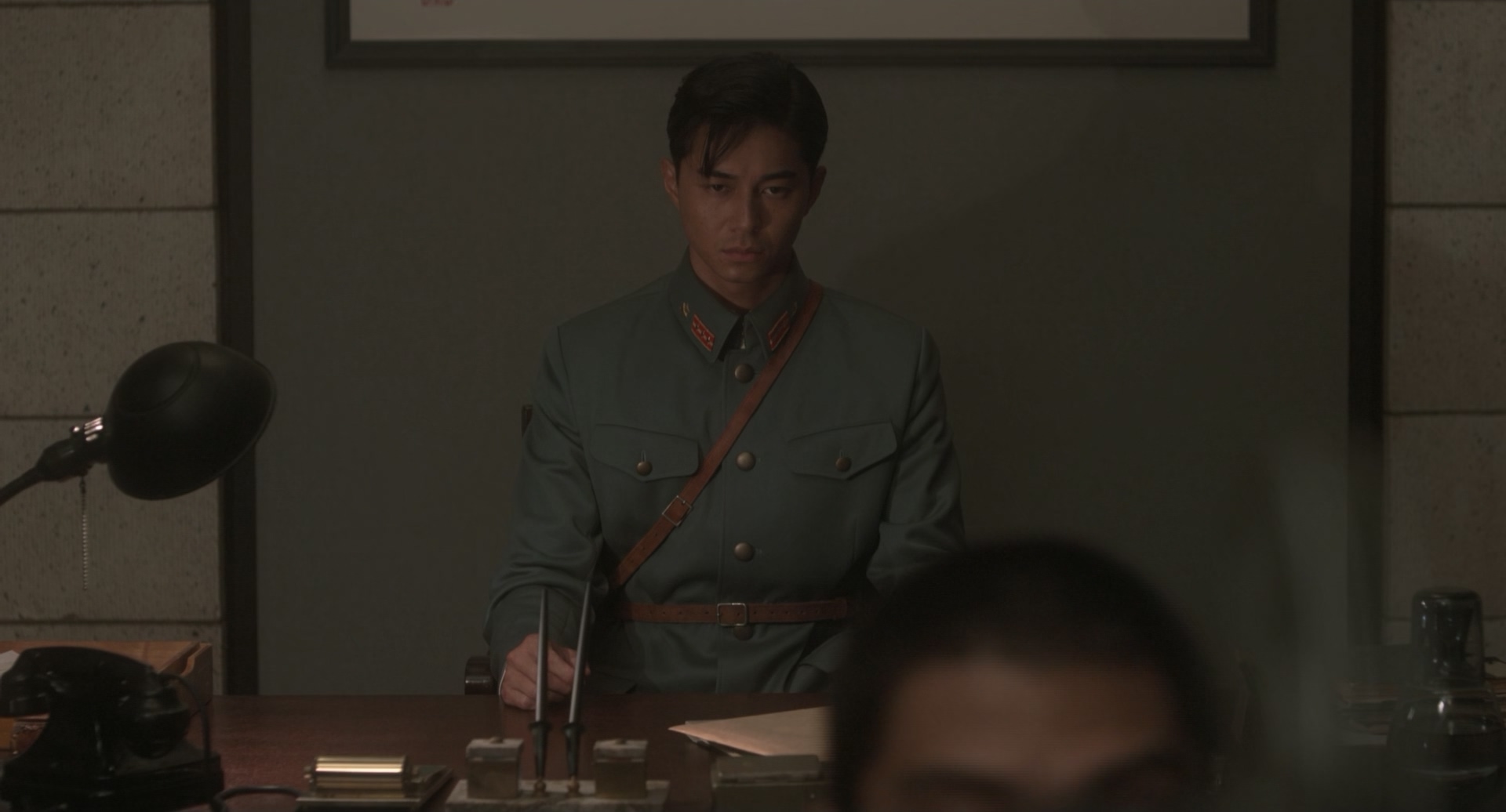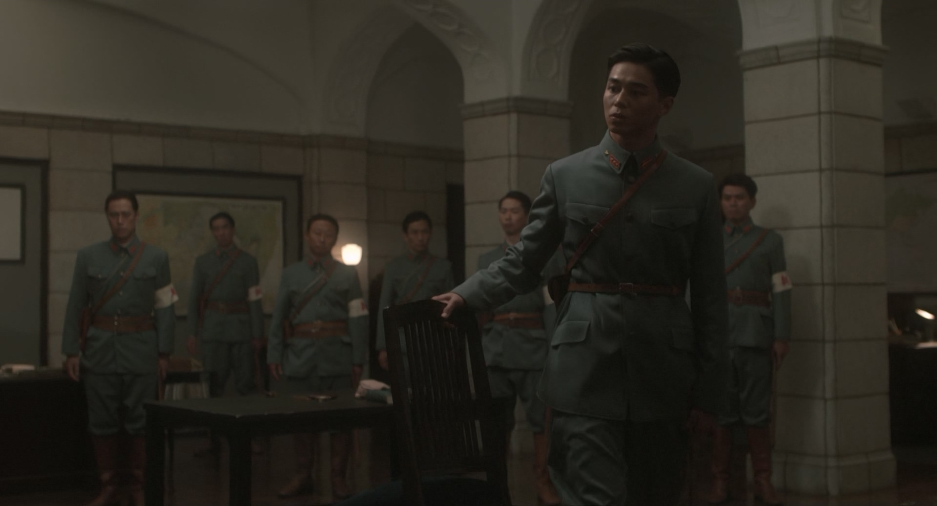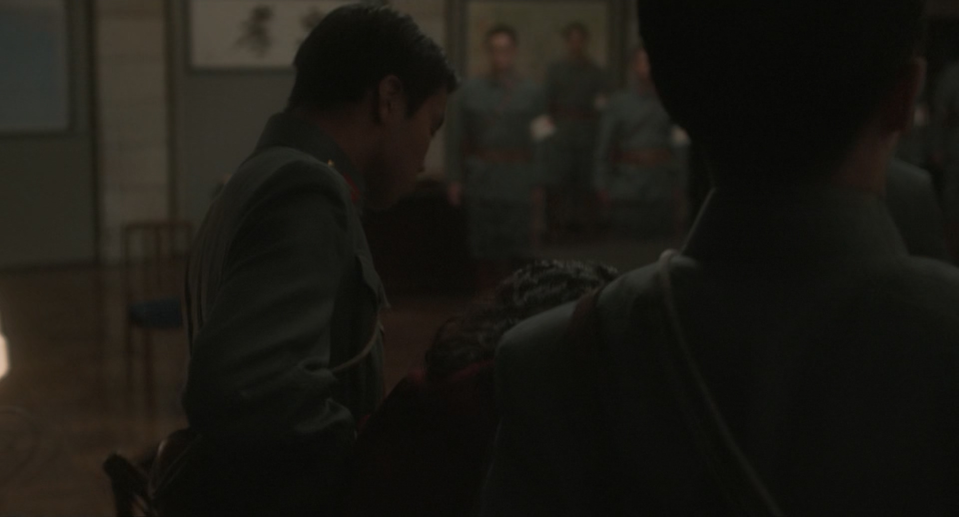 이 샷은 단독샷 치고는 넓게 촬영되어 헤드룸도 넓은데, 인물의 앞에 라이트를 가깝게 배치하여 뒤에 커다란 그림자가 생기는게 재밌다. 그리고 타이지의 좌우로 헌병대를 배치하였다.