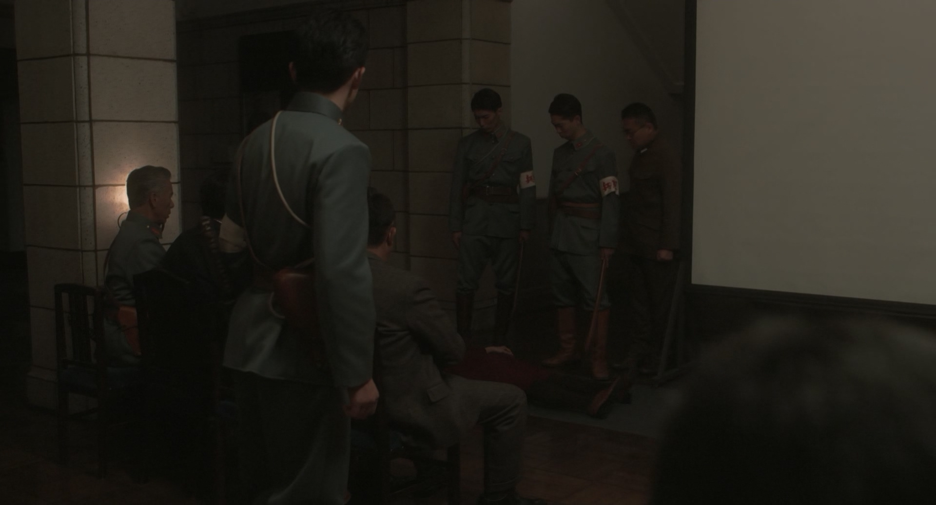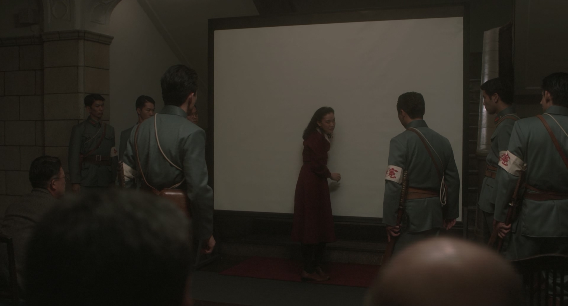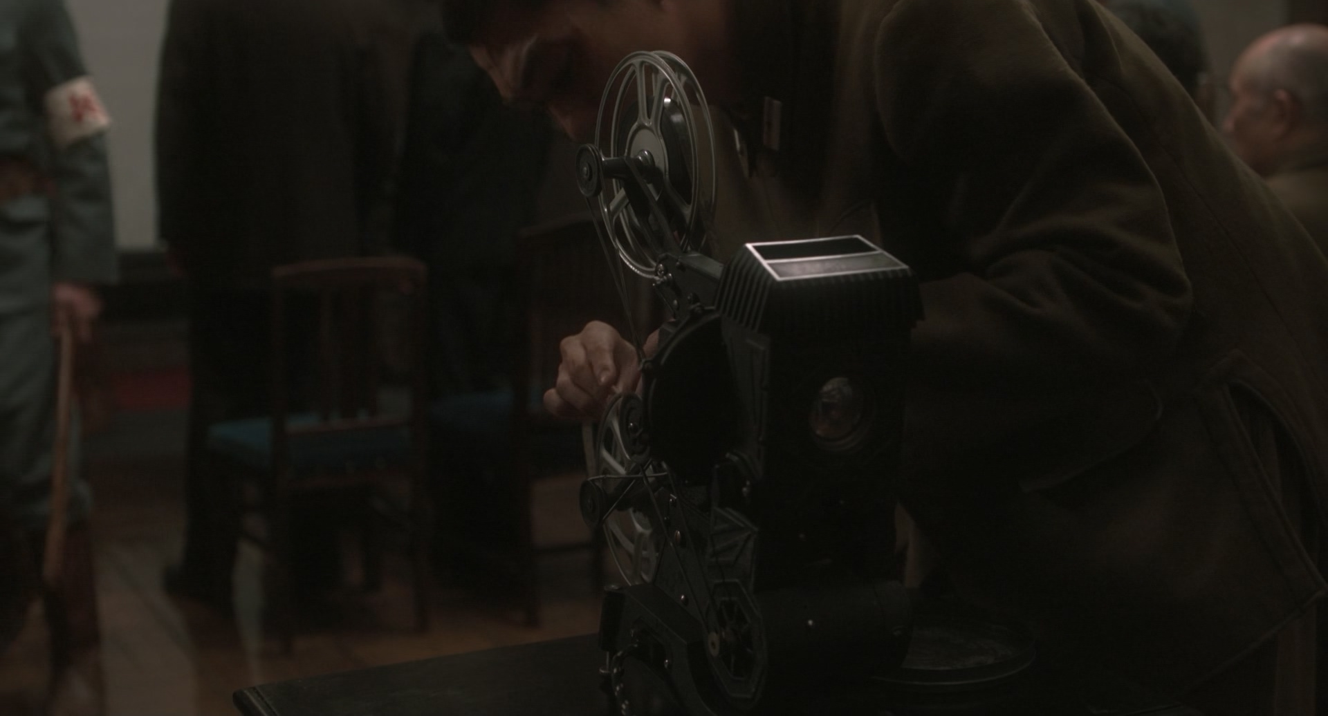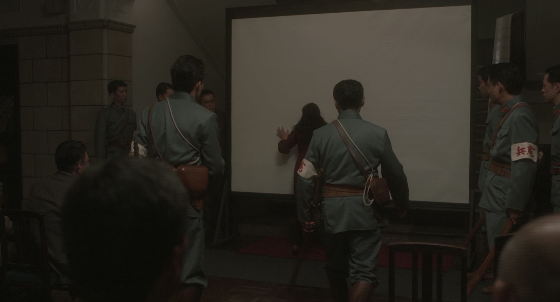 영사기 라이트 앞으로 들어온 누군가의 손가락을 통해 드리운 그림자가 마치 화면서 사토코를 가리키는 것 같은 샷. 그리고 앞에 있는 헌병들도 뒤 돌아서 사토코를 바라본다. 동일샷의 연속이고, 사실 관객은 스크린 속 영화 화면에 집중할테지만 이런 리액션들이 중복되지 않는다는 사실은 영화를 두세번 보는 관객의 입장에선 상당히 흥미롭고 디테일한 장치 같다.