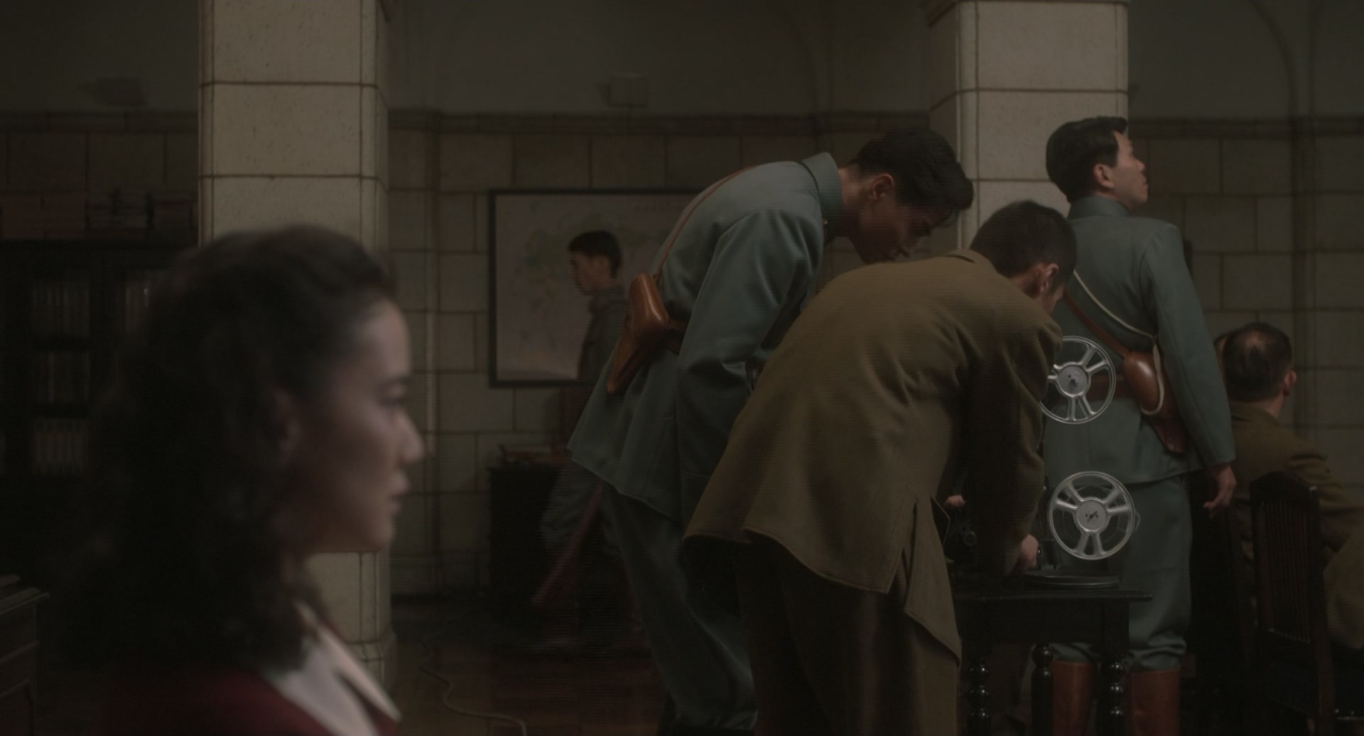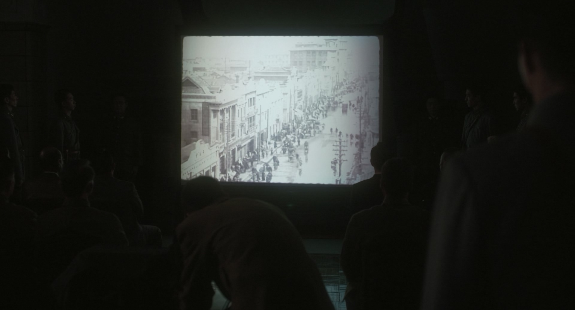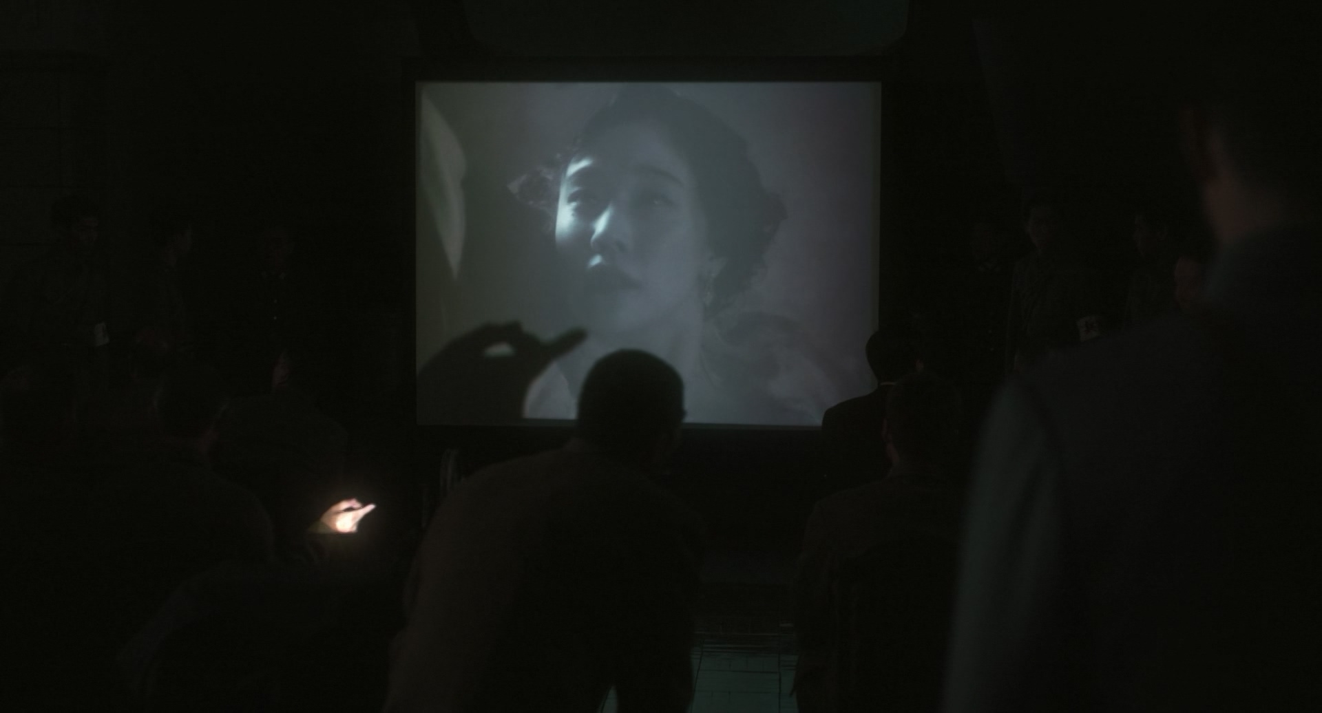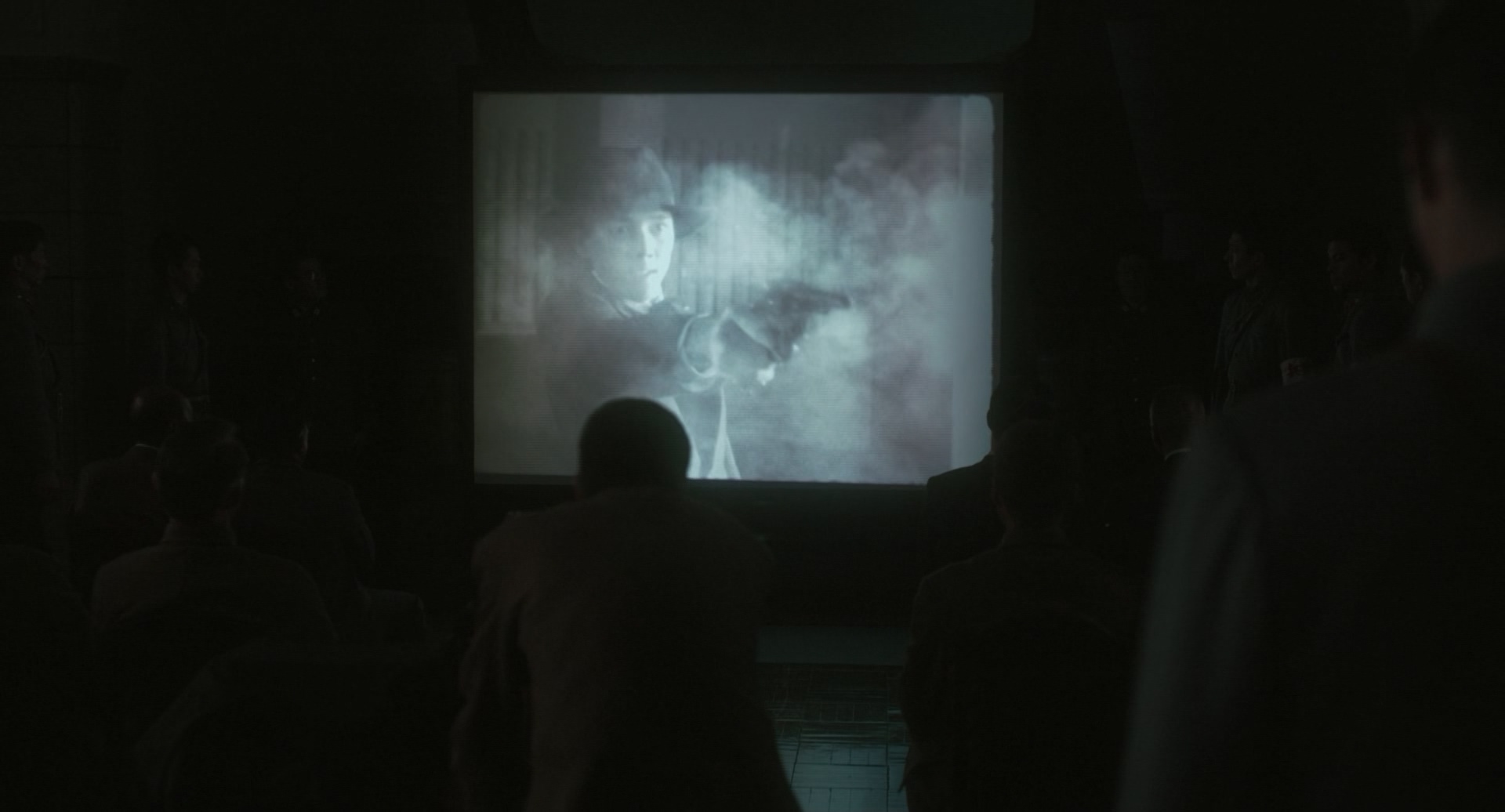 영사기 라이트 앞으로 들어온 누군가의 손가락을 통해 드리운 그림자가 마치 화면서 사토코를 가리키는 것 같은 샷. 그리고 앞에 있는 헌병들도 뒤 돌아서 사토코를 바라본다. 동일샷의 연속이고, 사실 관객은 스크린 속 영화 화면에 집중할테지만 이런 리액션들이 중복되지 않는다는 사실은 영화를 두세번 보는 관객의 입장에선 상당히 흥미롭고 디테일한 장치 같다.