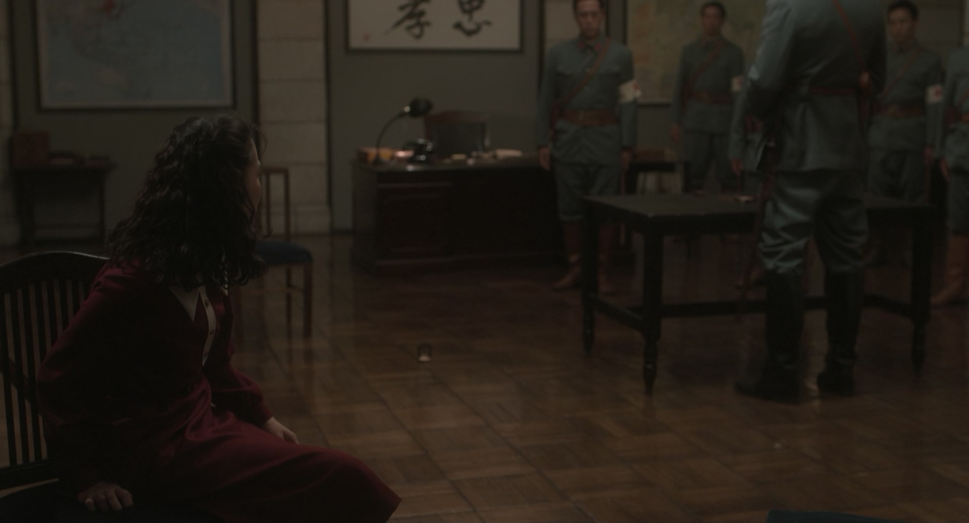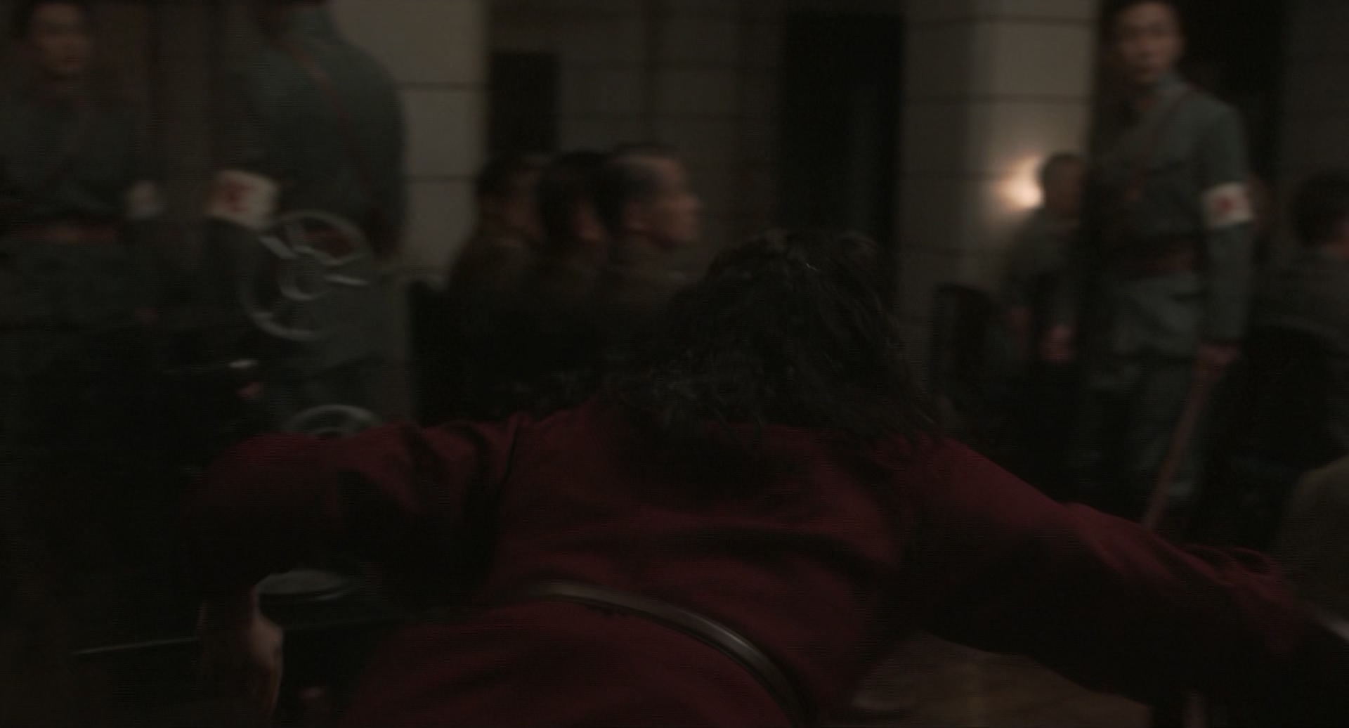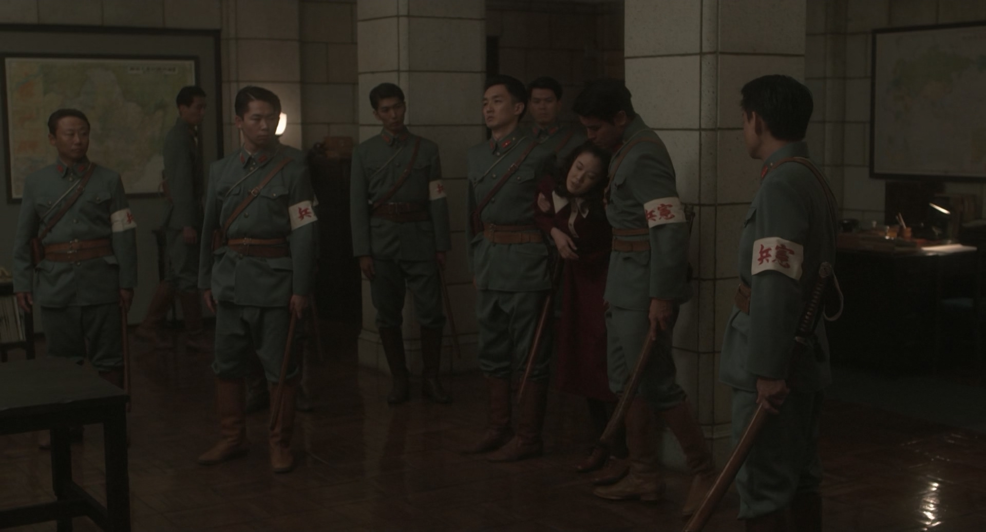 꽤 긴 롱테이크로 시작하는 씬의 첫 컷. 좌측에서 사토코가 헌병대에게 둘러쌓여 프레임인. 상당히 가까이서 등장하여 주변 배경이 잘 보이지 않고, 주변 인물들보다 낮게 위치하여 답답한 느낌을 준다.