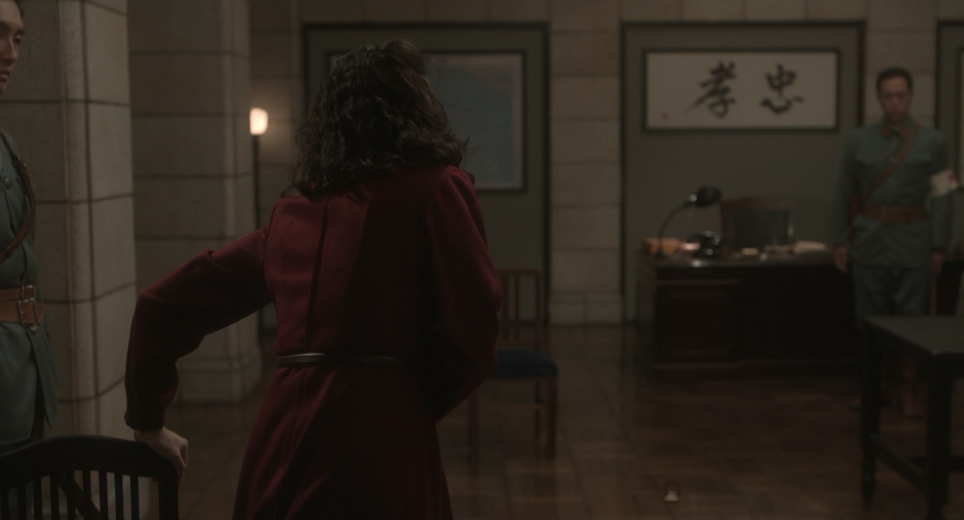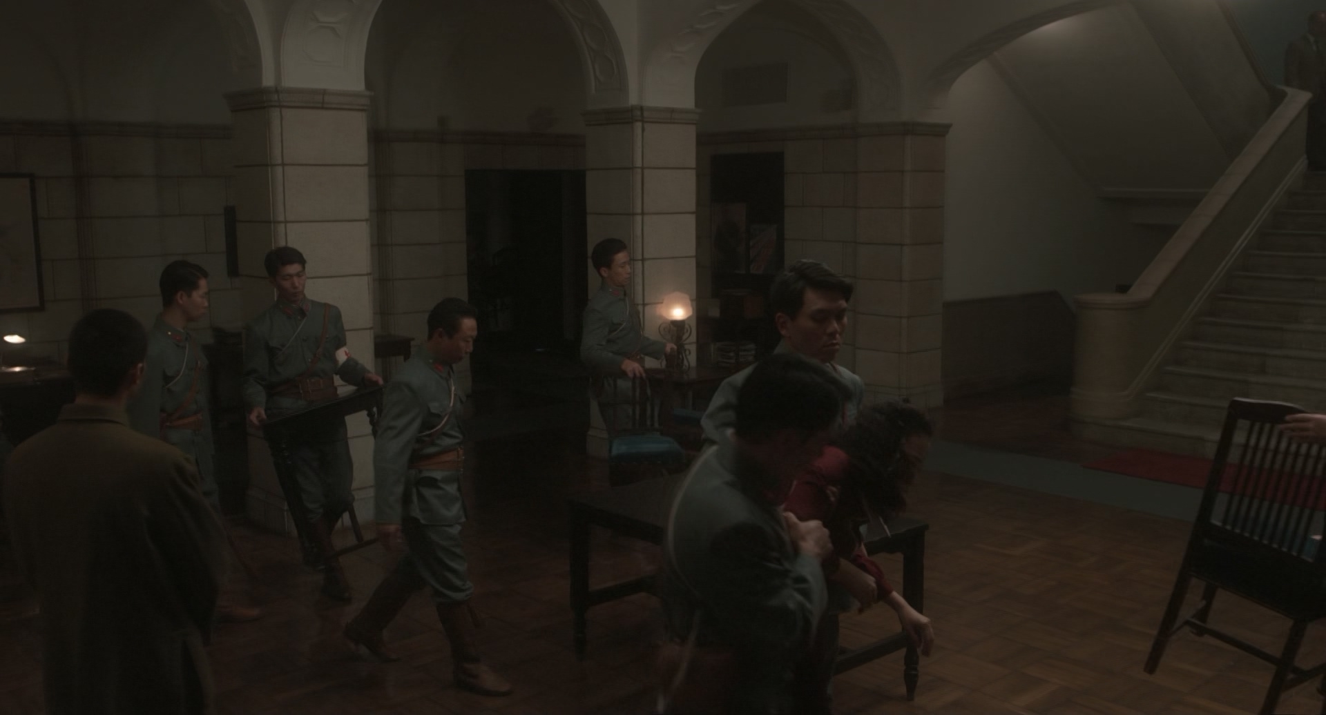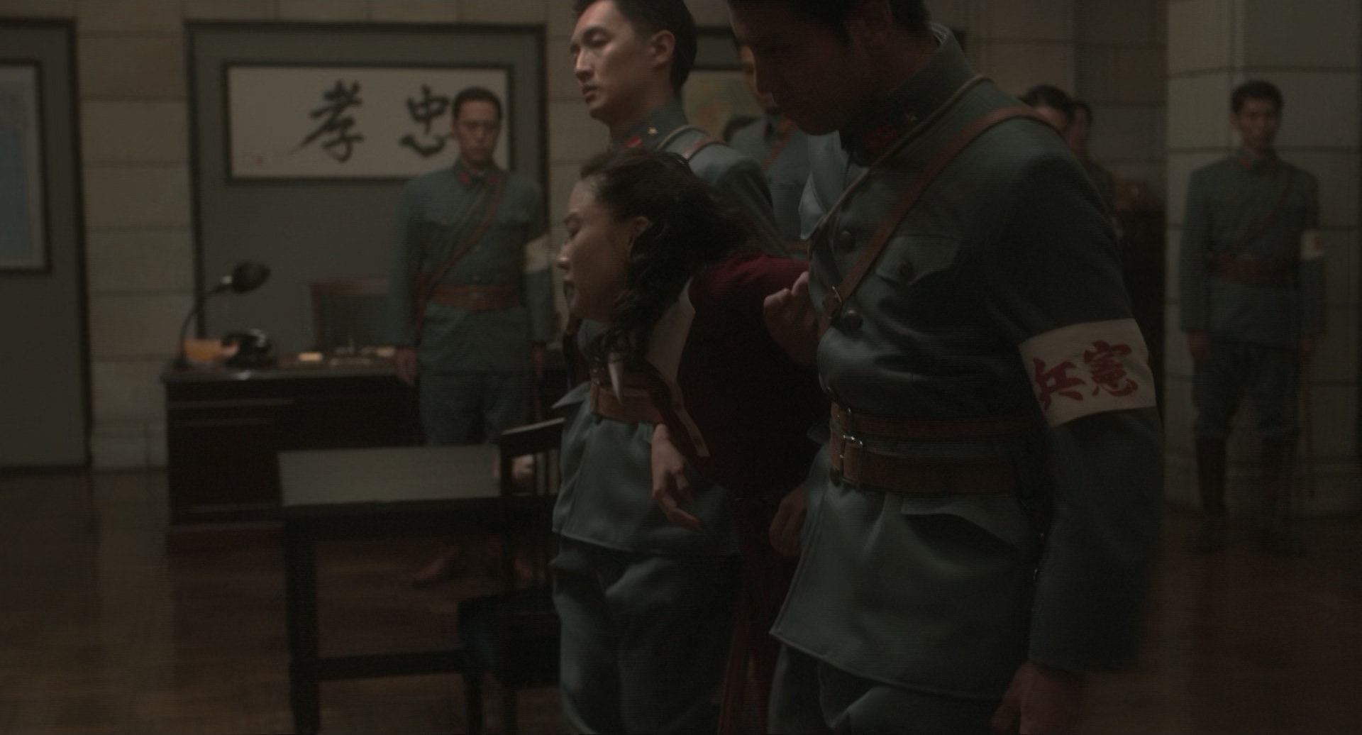 꽤 긴 롱테이크로 시작하는 씬의 첫 컷. 좌측에서 사토코가 헌병대에게 둘러쌓여 프레임인. 상당히 가까이서 등장하여 주변 배경이 잘 보이지 않고, 주변 인물들보다 낮게 위치하여 답답한 느낌을 준다.