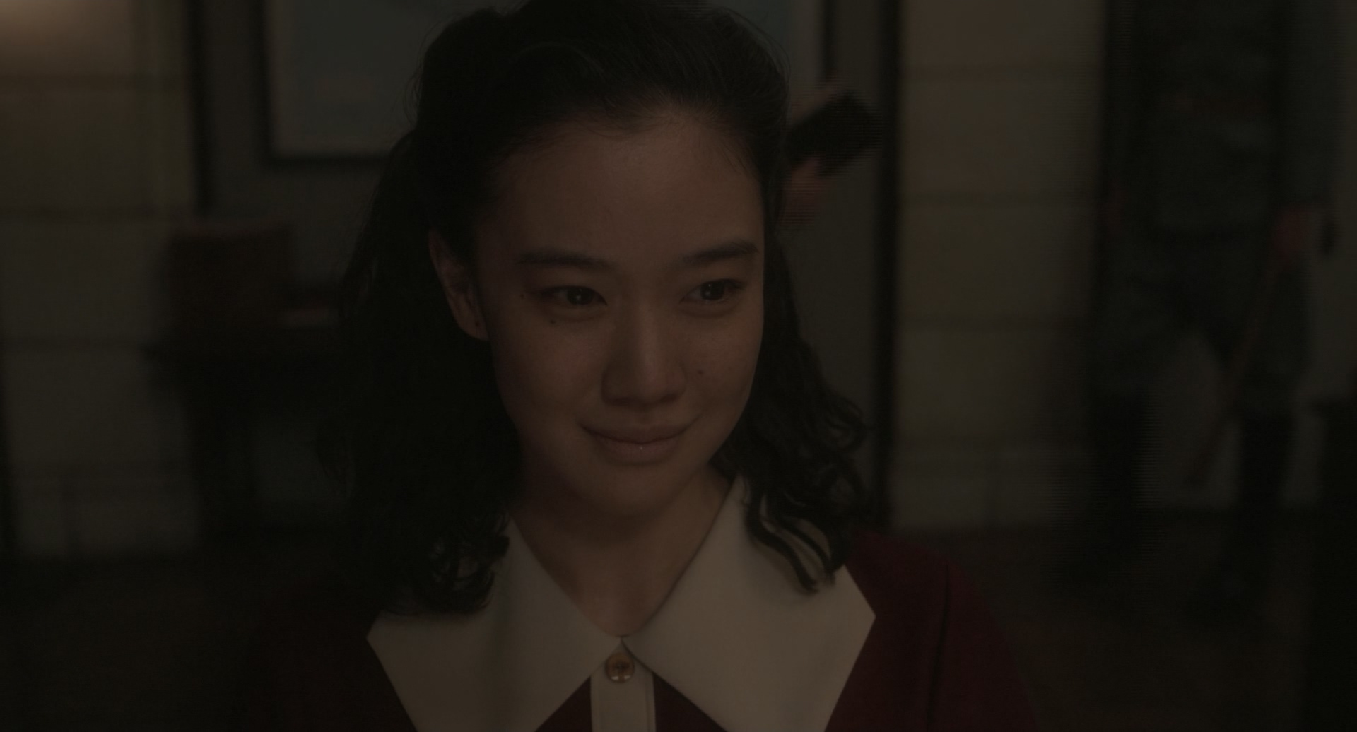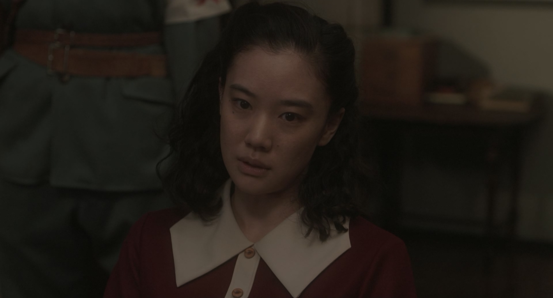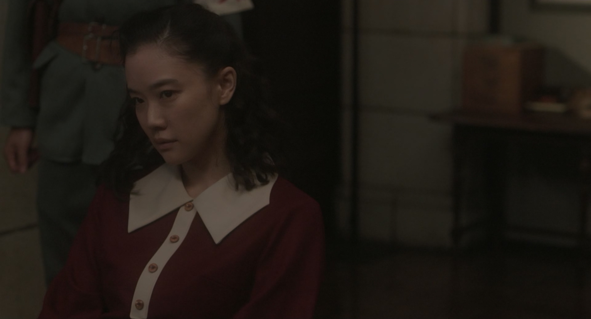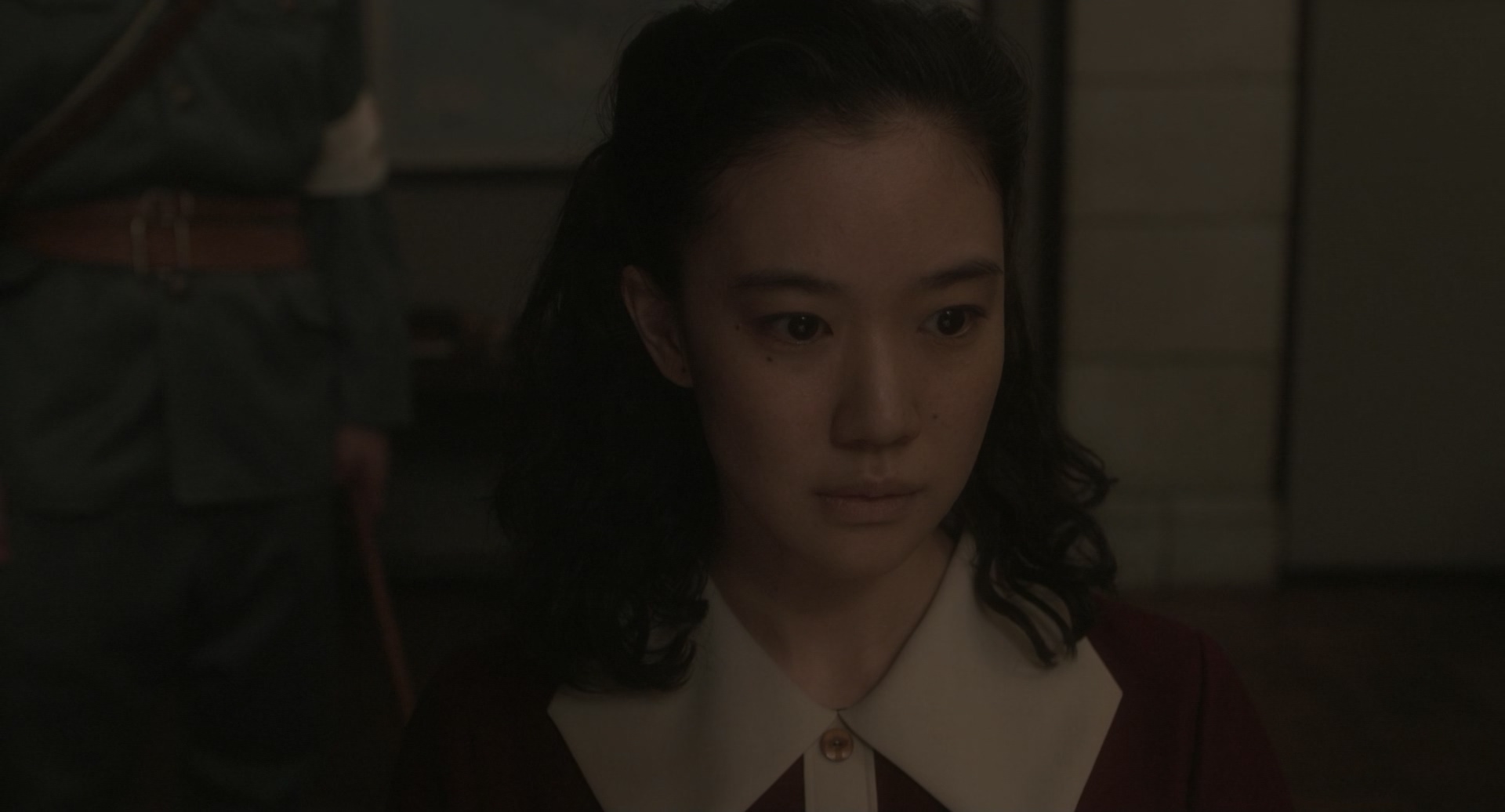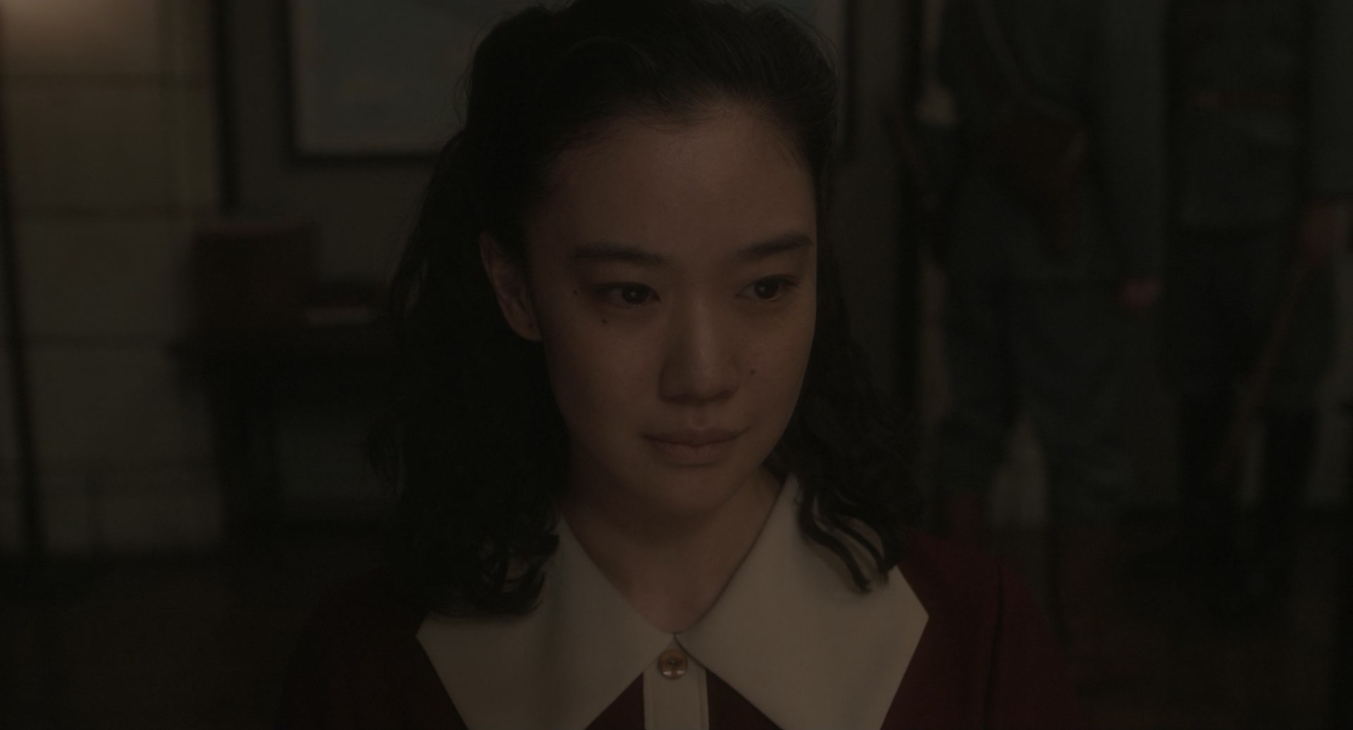 사토코의 좌우, 카메라의 앞에도 남자들이 블로킹되어 둘러쌓인 느낌을 준다. 가까이에 사토코의 정면에 위치했던 헌병이 사토코가 웃자 뒷걸음질 친다. 그럴만도 하다. 이 씬은 사토코(아오이 유우)의 연기를 통해 압도 당하게 된다.