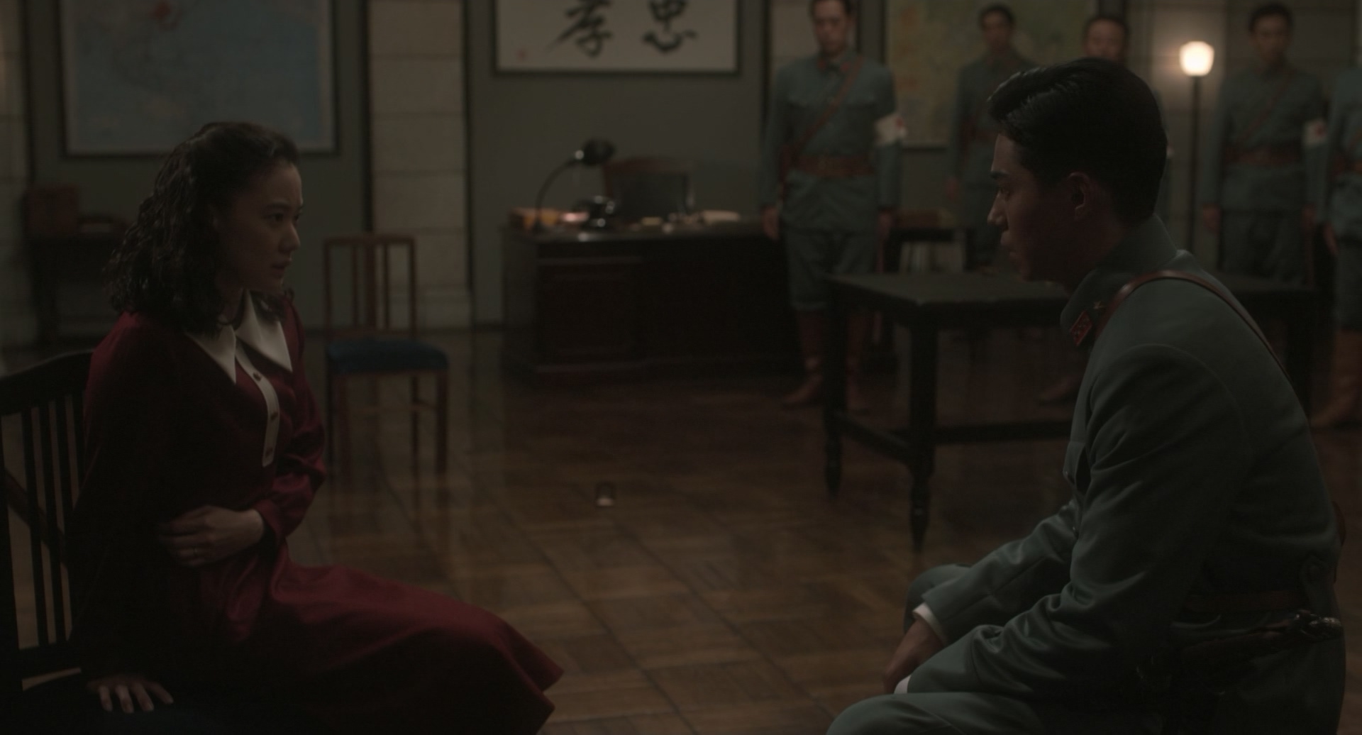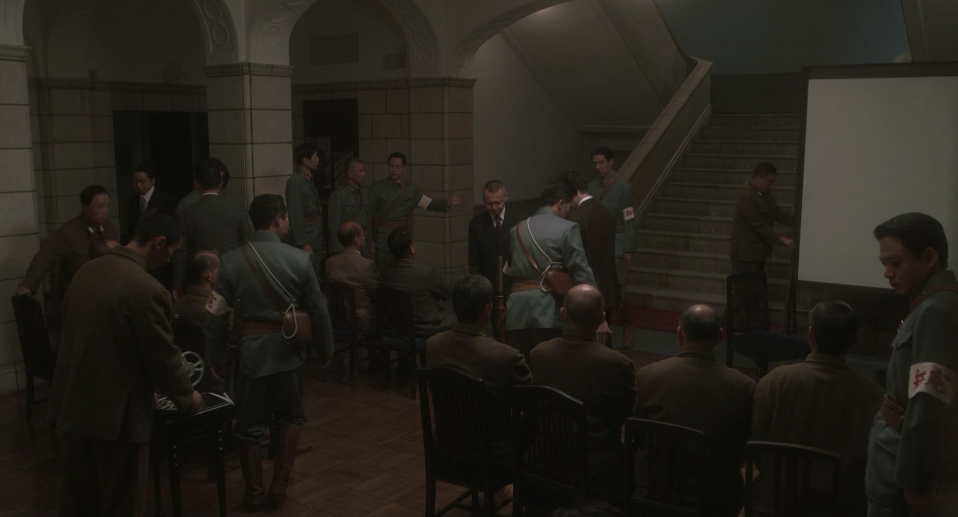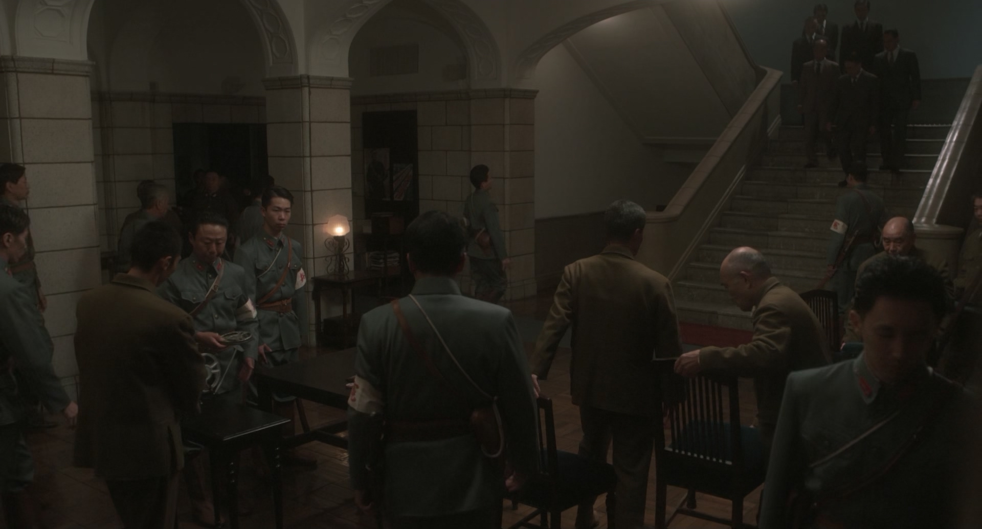 컷의 끝까지 인물의 거리가 가까워지고 좁혀지고를 반복한다. 물론 그 움직임에 사토코의 의지는 전혀 없다. 자세히 보면 카메라가 오른쪽으로 살짝 트래킹한다. 거장 답게 이유 없는 움직임은 없는 법. 엔드 지점에서의 대치샷에서는역시 타이지 쪽 백에 위치한 헌병대들을 통해 압박감을 준다.