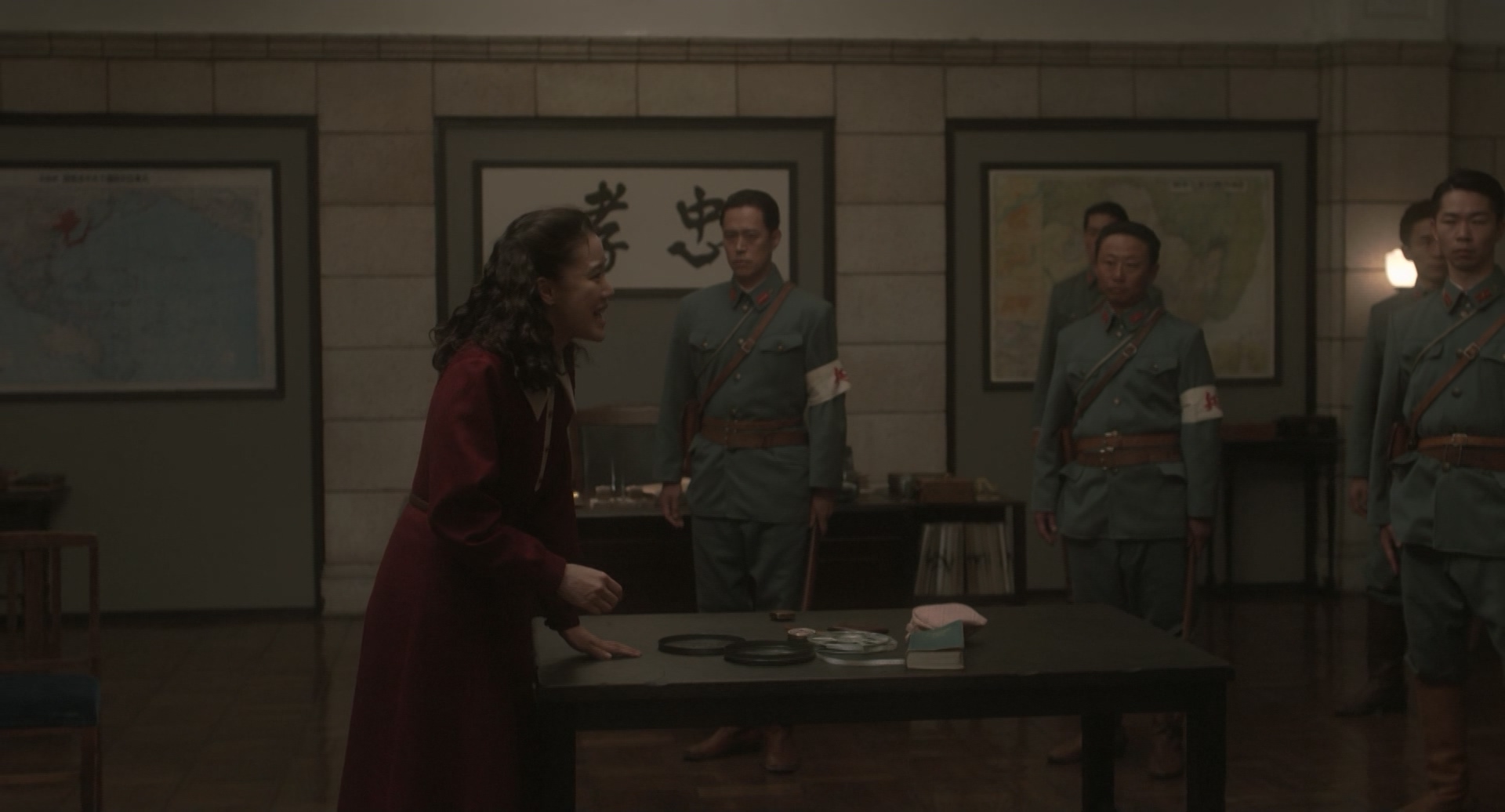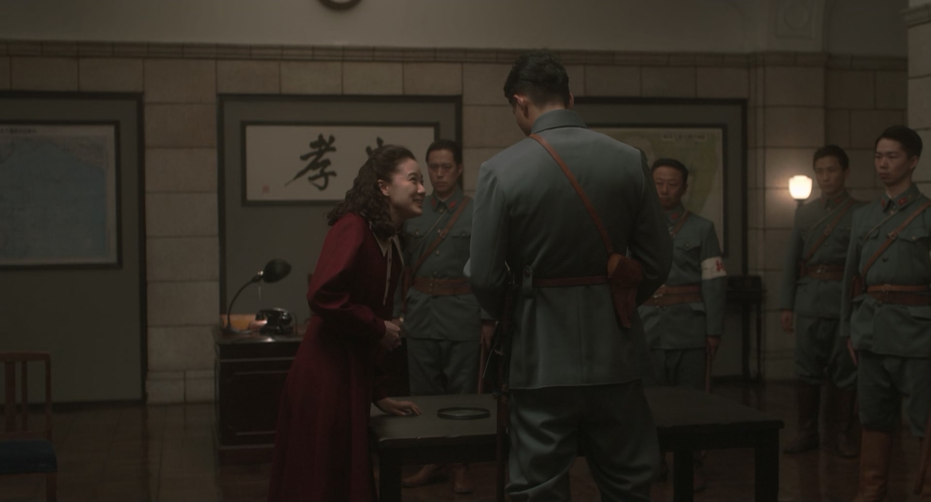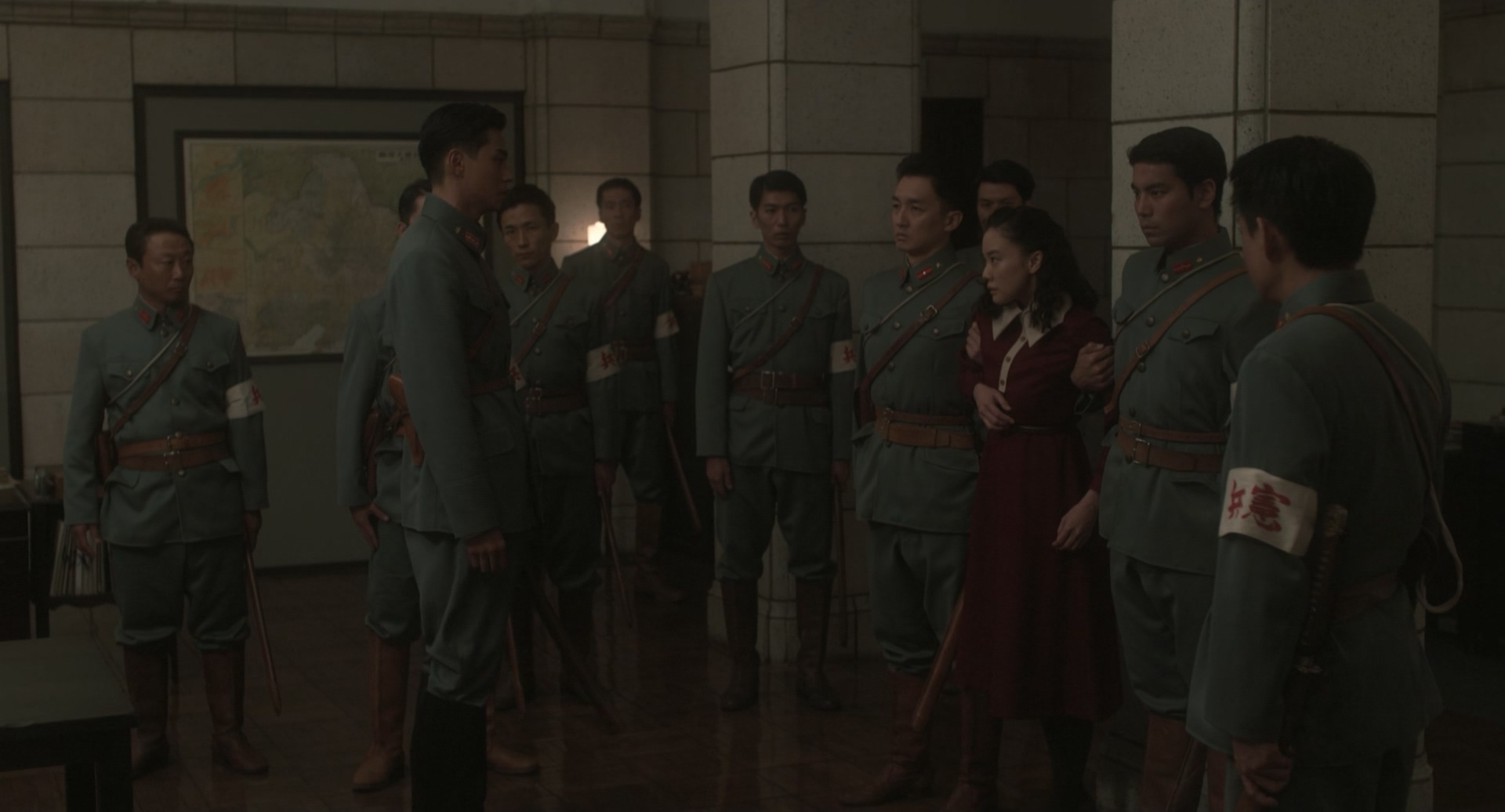 컷의 끝까지 인물의 거리가 가까워지고 좁혀지고를 반복한다. 물론 그 움직임에 사토코의 의지는 전혀 없다. 자세히 보면 카메라가 오른쪽으로 살짝 트래킹한다. 거장 답게 이유 없는 움직임은 없는 법. 엔드 지점에서의 대치샷에서는역시 타이지 쪽 백에 위치한 헌병대들을 통해 압박감을 준다.