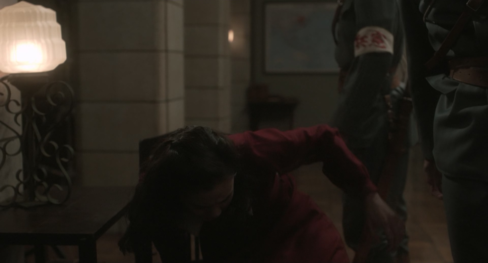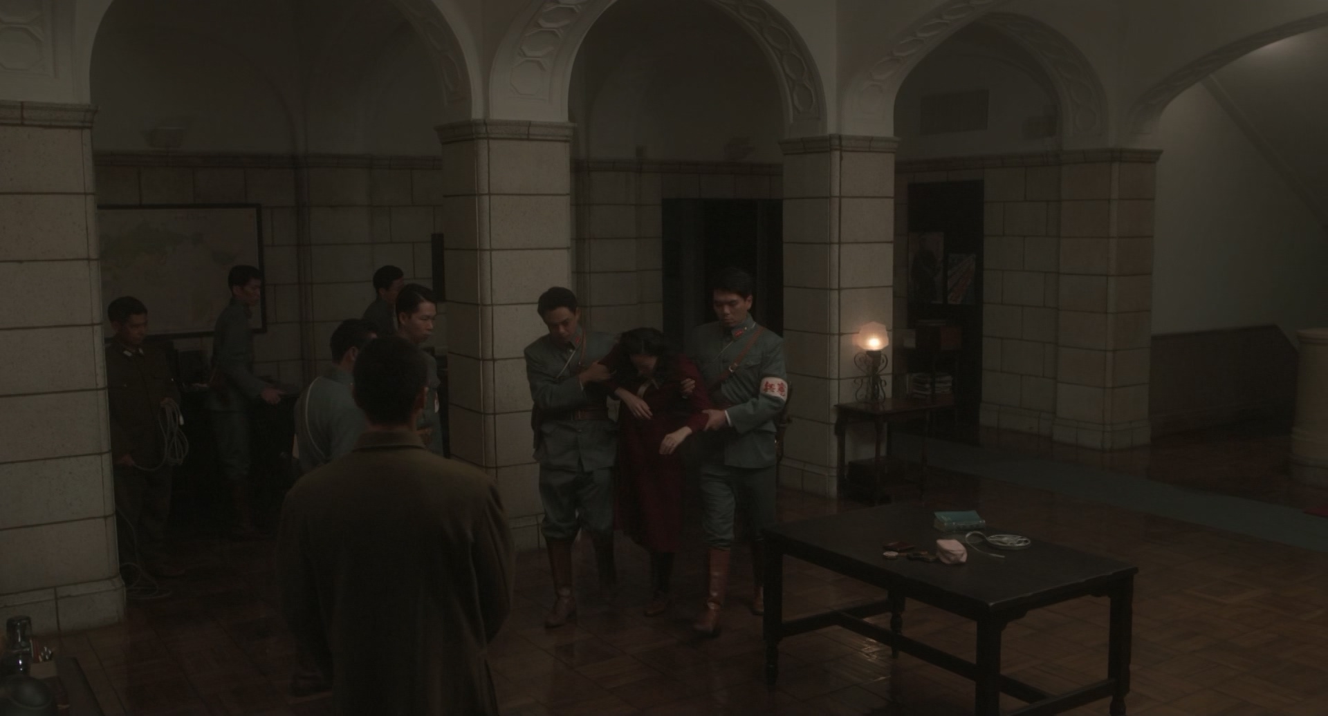 그리고 휘청이다 좌측으로 졸도하는 사토코. 카메라도 그를 따라서 살짝 좌측으로 패닝. 뒷걸음질 치는 헌병의 위치 역시 설계된 듯 하다.원래 위치라면 이 지점에서 넘어지는 사토코를 가렸을테니까 말이다.