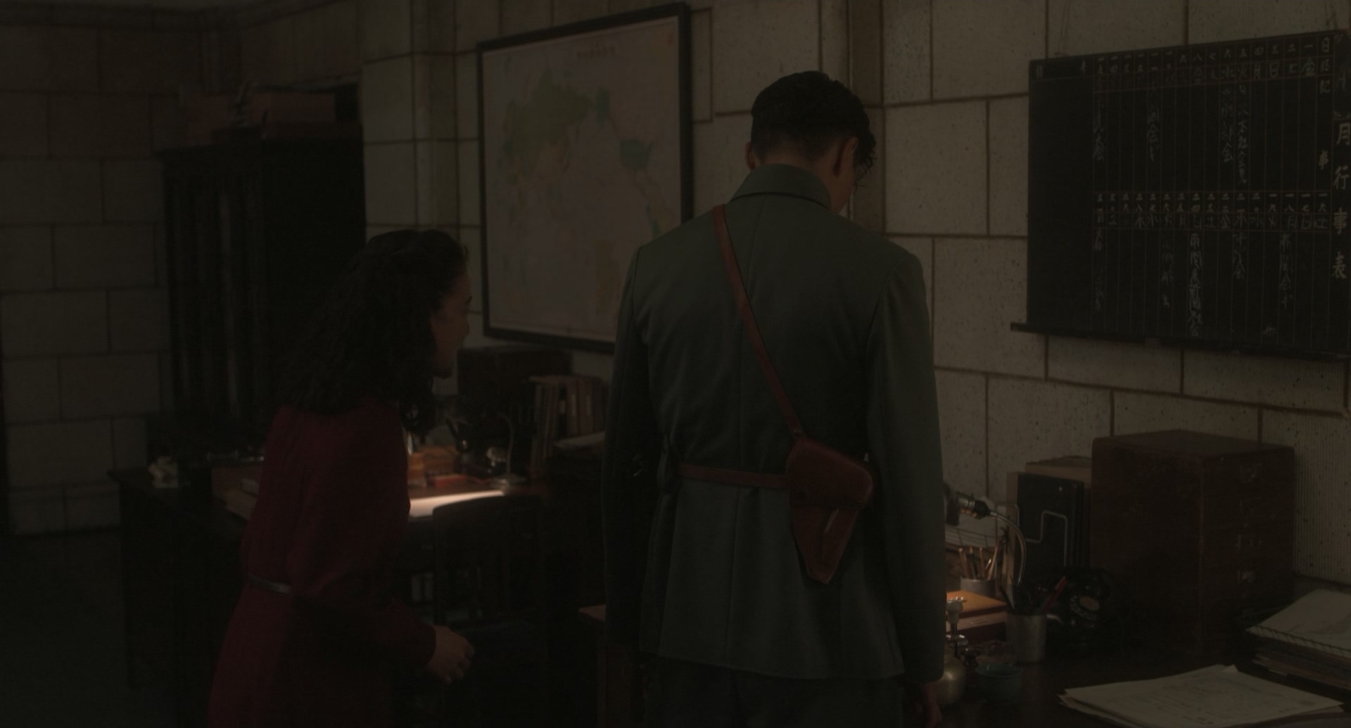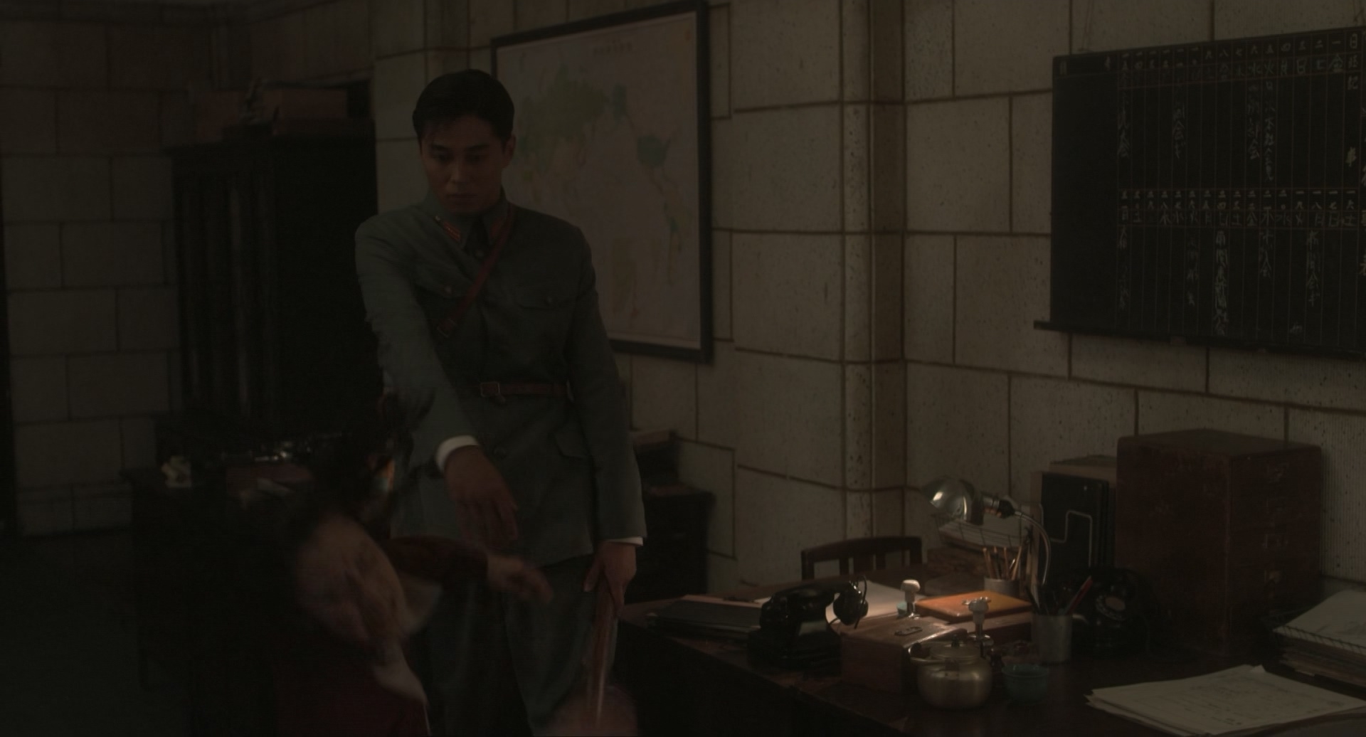 아직도 복잡스러운 표정의 타이지. 앞에서 준비되었다고 말하는 헌병의 말에 일어나서 조명을 끄고 앞으로 위치한다. 그리고 좌측 대각선으로 살짝 트래킹하여 사토코를 비춘다.