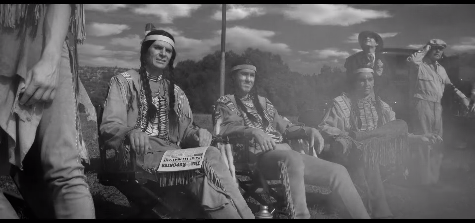 담배를 피며 침을 뱉는 스태프, 카메라 뒤로 인디언 분장을 한 엑스트라들이 한 화면에 담겨있는 이질적이고도 재밌는 샷.