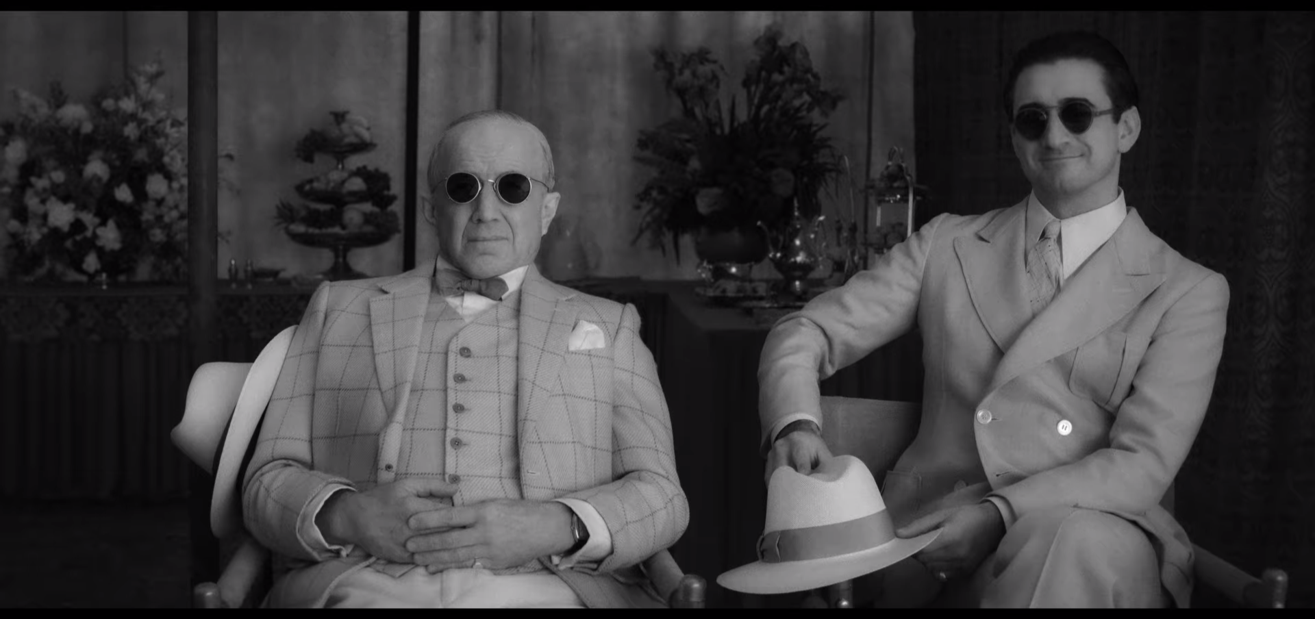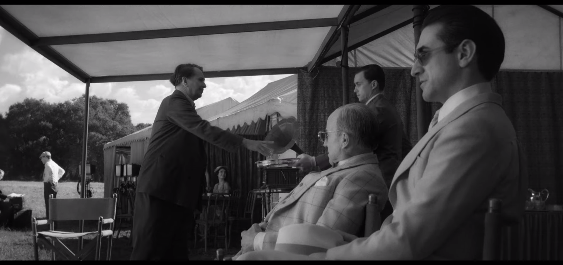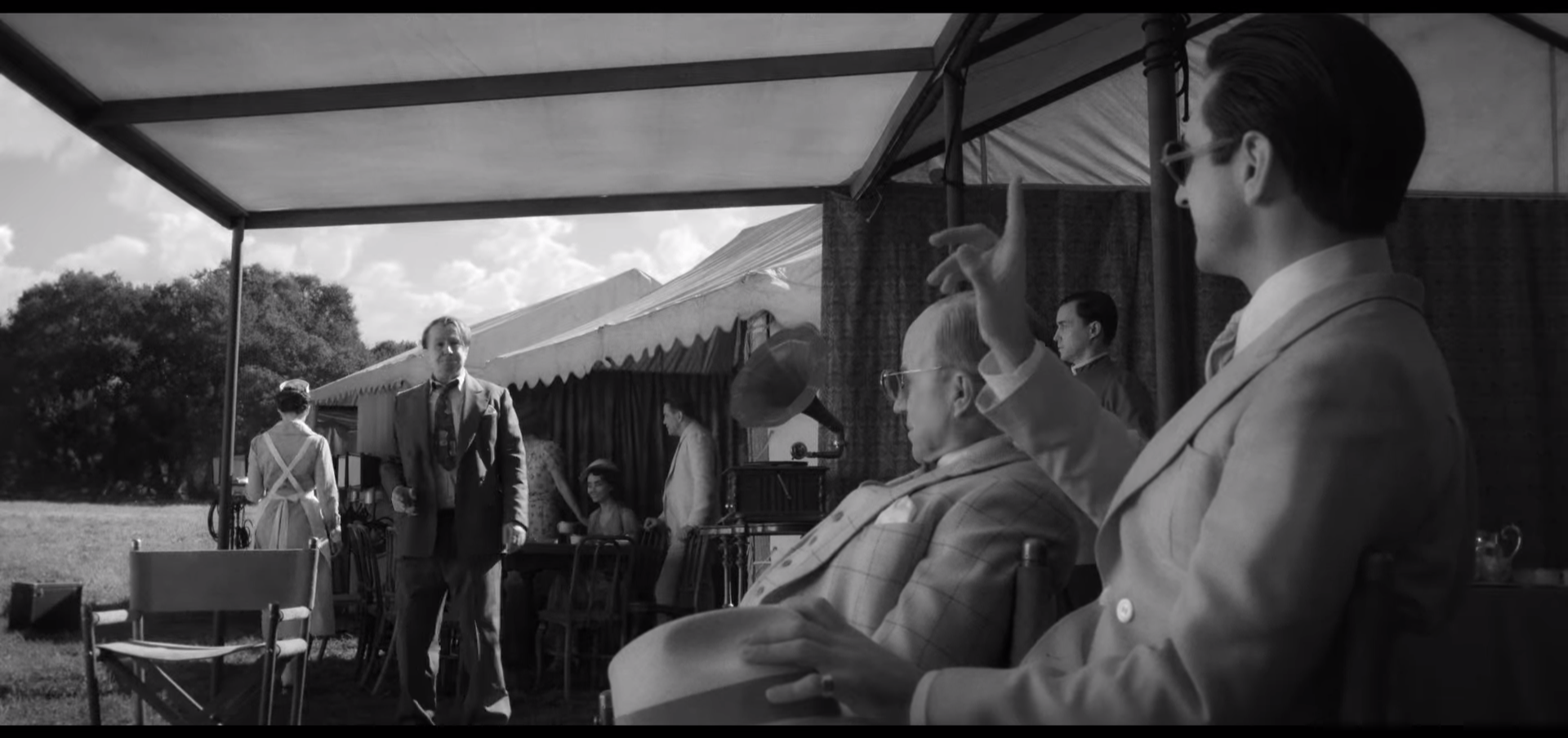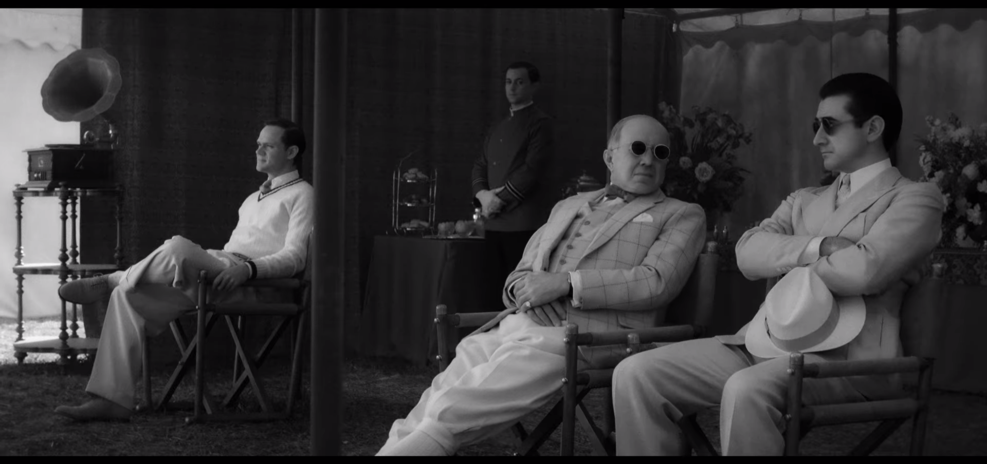 정적인 투샷에 비해 맹크의 샷에서는 인물들이 꾸준히 움직이기 때문에 훨씬 동적이고 밝은 느낌이 든다. 괜히 무게 잡는 제작자들에 비교되는 맹크의 자유로운 성격을 더 극대화해주는 역할도 하는 것 같은 인물과 배경 배치.