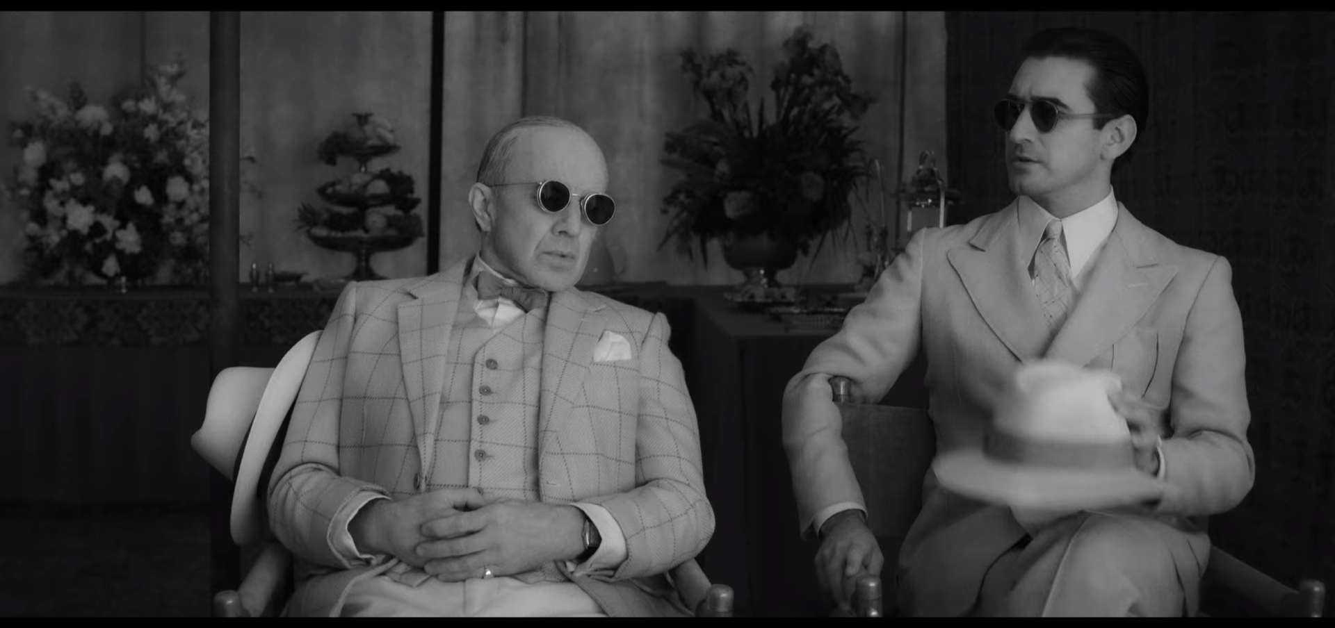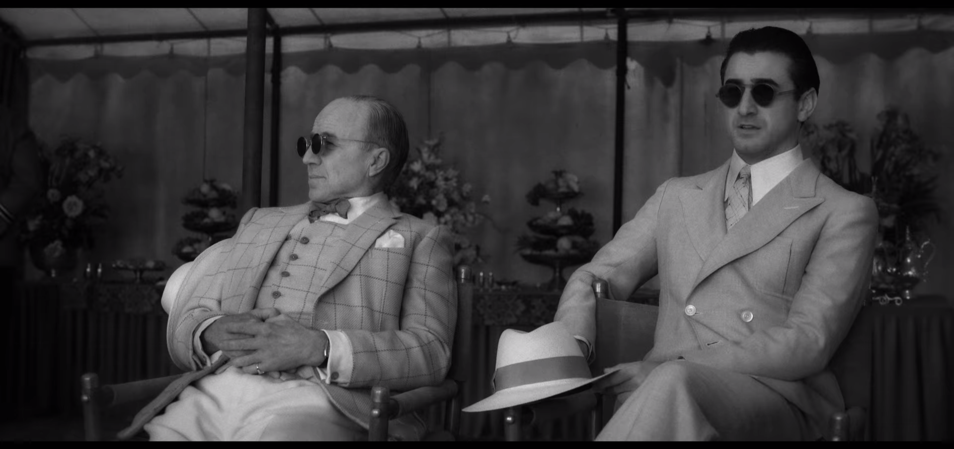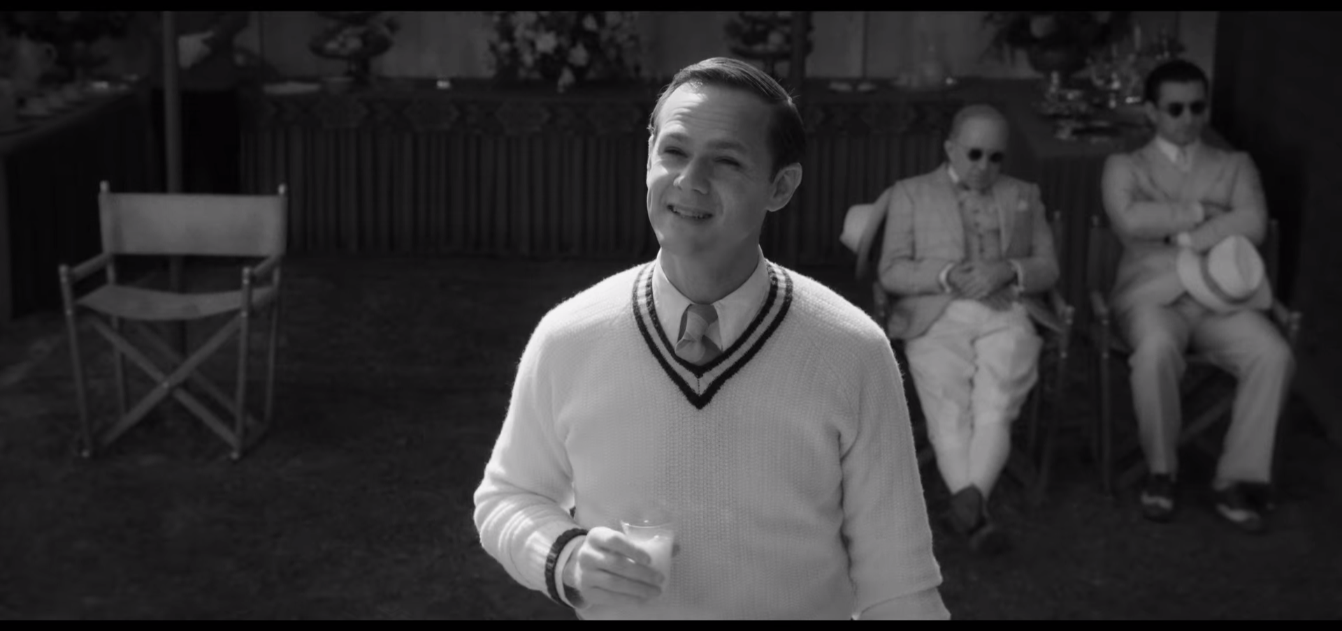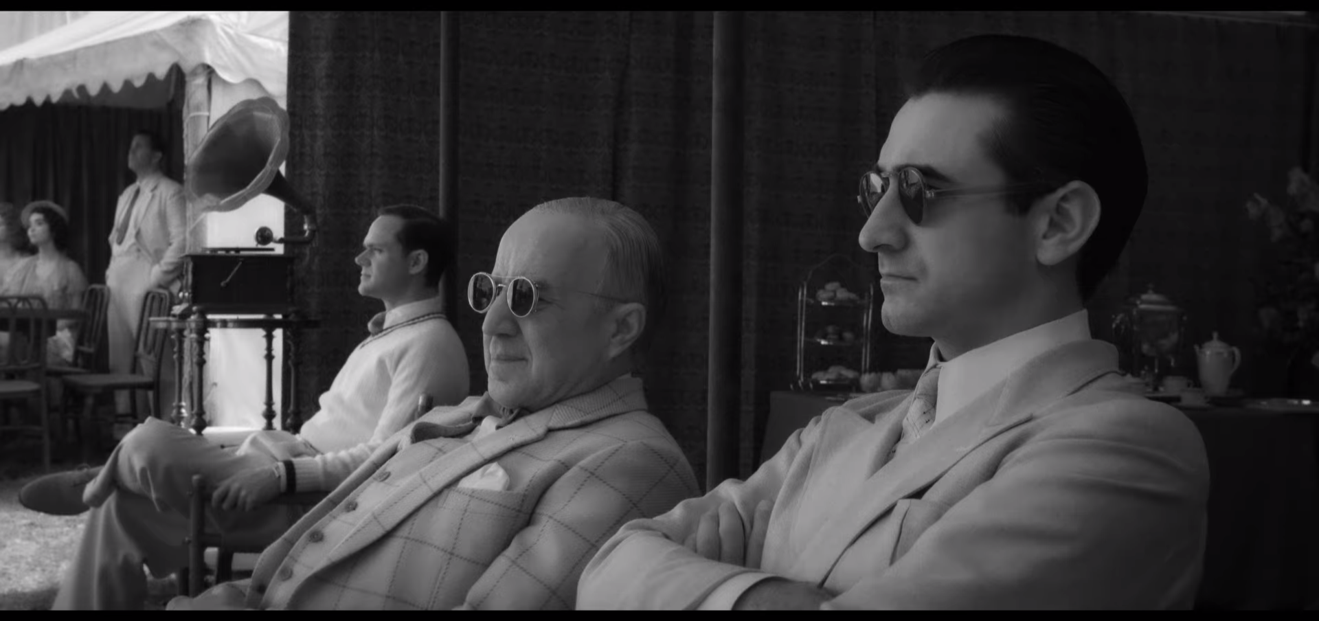 정적인 투샷에 비해 맹크의 샷에서는 인물들이 꾸준히 움직이기 때문에 훨씬 동적이고 밝은 느낌이 든다. 괜히 무게 잡는 제작자들에 비교되는 맹크의 자유로운 성격을 더 극대화해주는 역할도 하는 것 같은 인물과 배경 배치.
