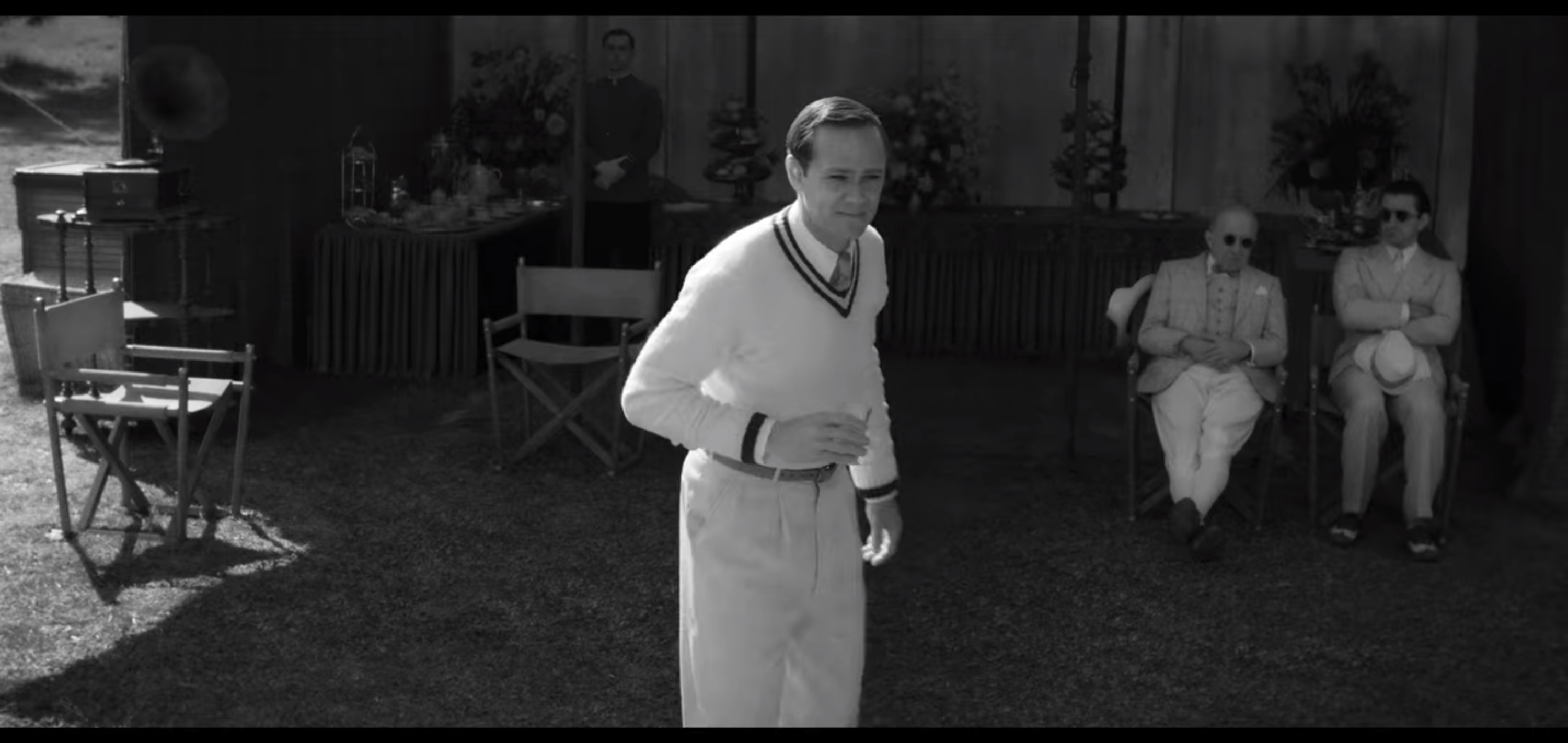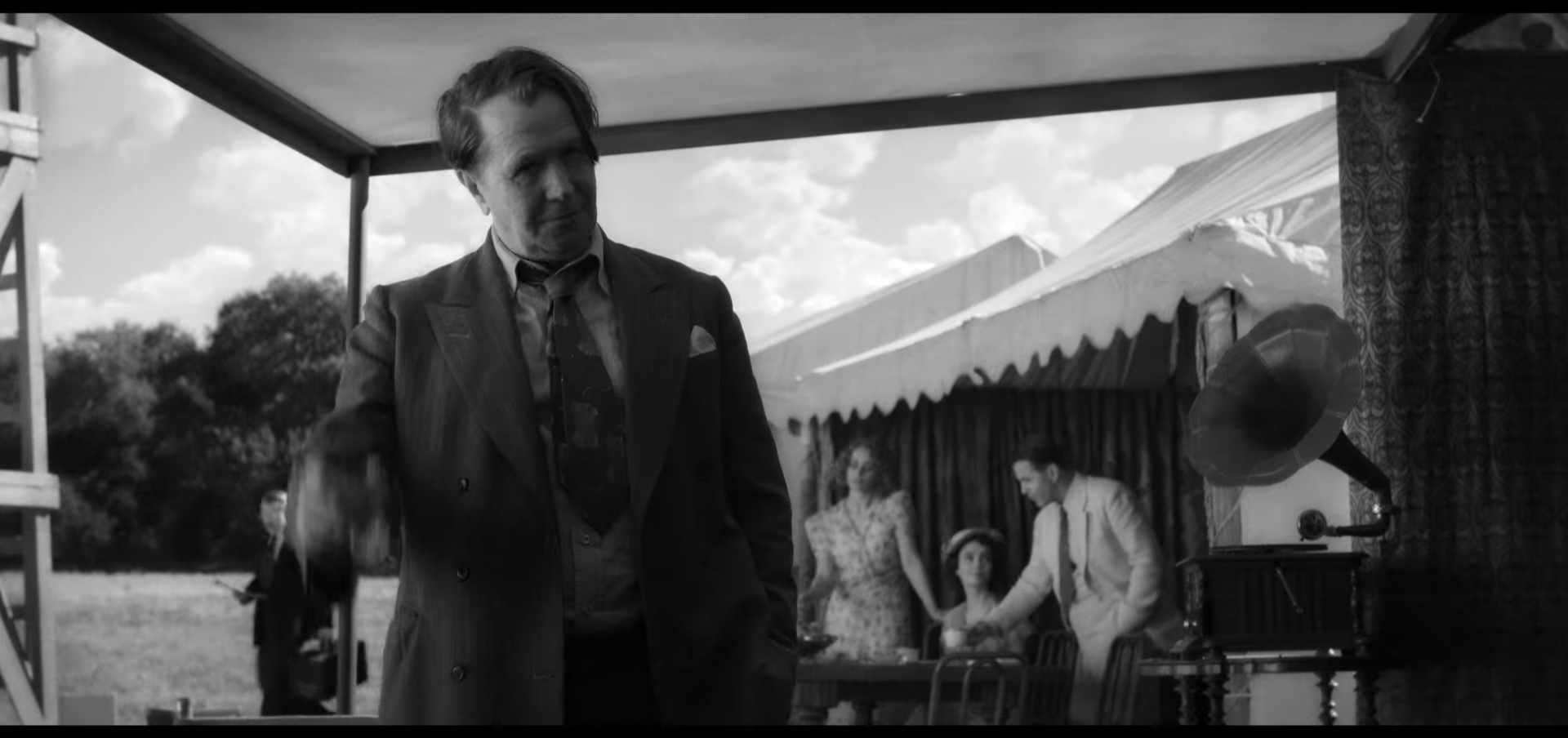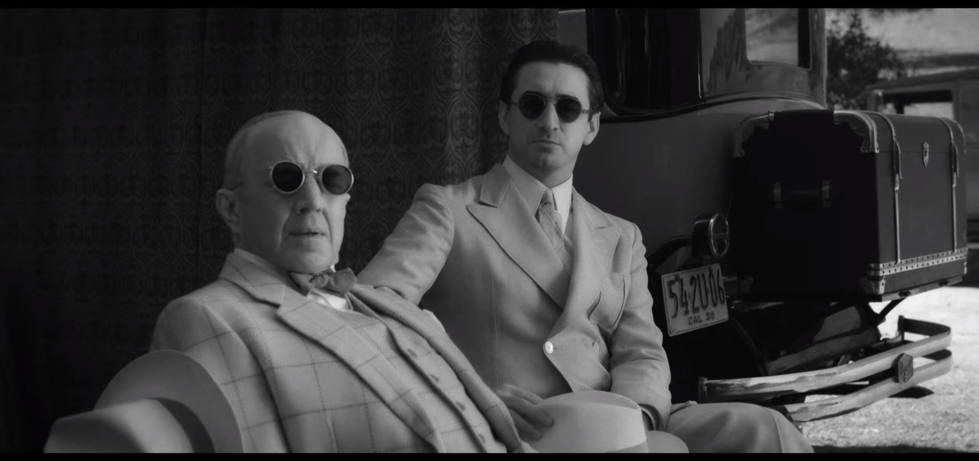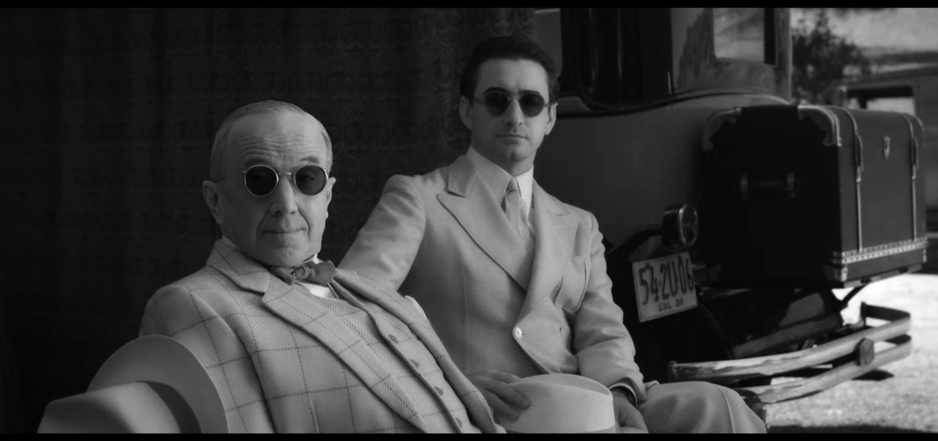 정적인 투샷에 비해 맹크의 샷에서는 인물들이 꾸준히 움직이기 때문에 훨씬 동적이고 밝은 느낌이 든다. 괜히 무게 잡는 제작자들에 비교되는 맹크의 자유로운 성격을 더 극대화해주는 역할도 하는 것 같은 인물과 배경 배치.