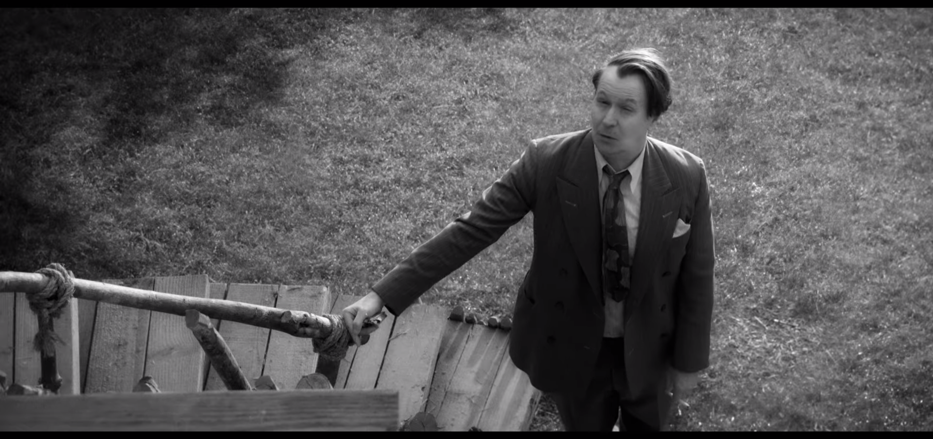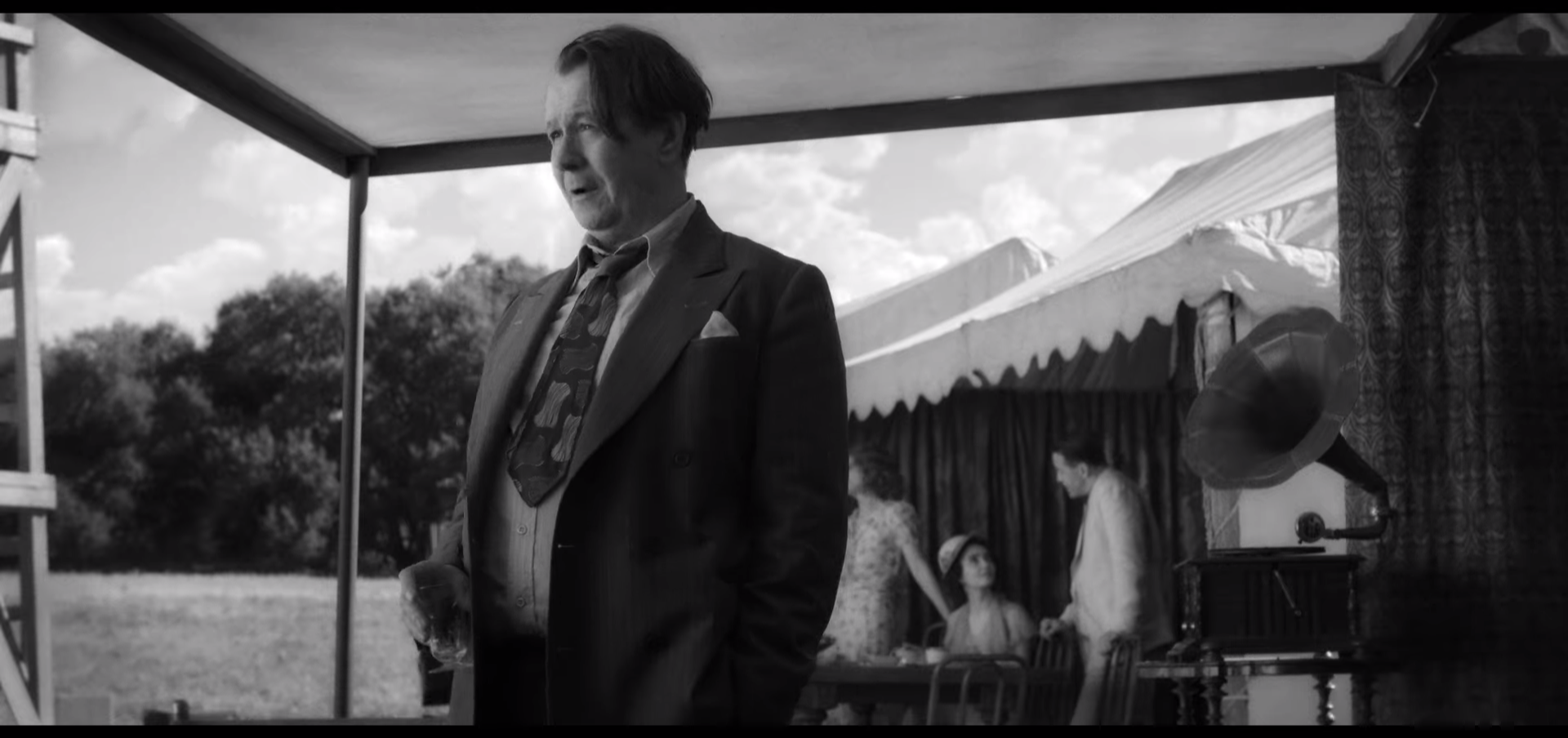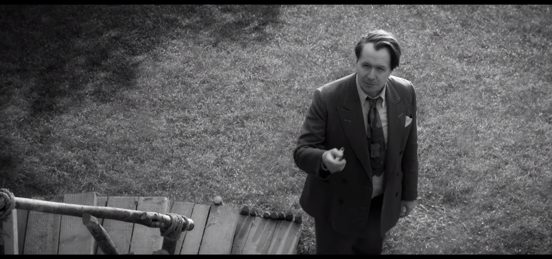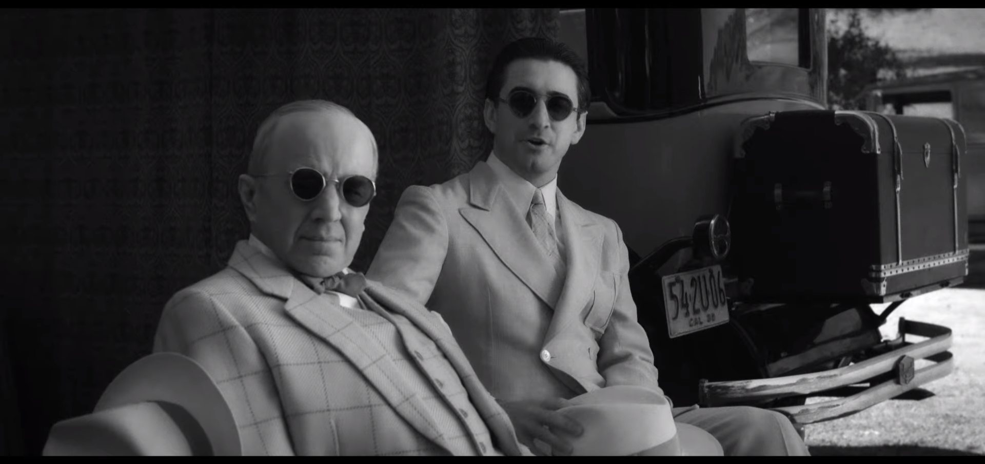 정적인 투샷에 비해 맹크의 샷에서는 인물들이 꾸준히 움직이기 때문에 훨씬 동적이고 밝은 느낌이 든다. 괜히 무게 잡는 제작자들에 비교되는 맹크의 자유로운 성격을 더 극대화해주는 역할도 하는 것 같은 인물과 배경 배치.