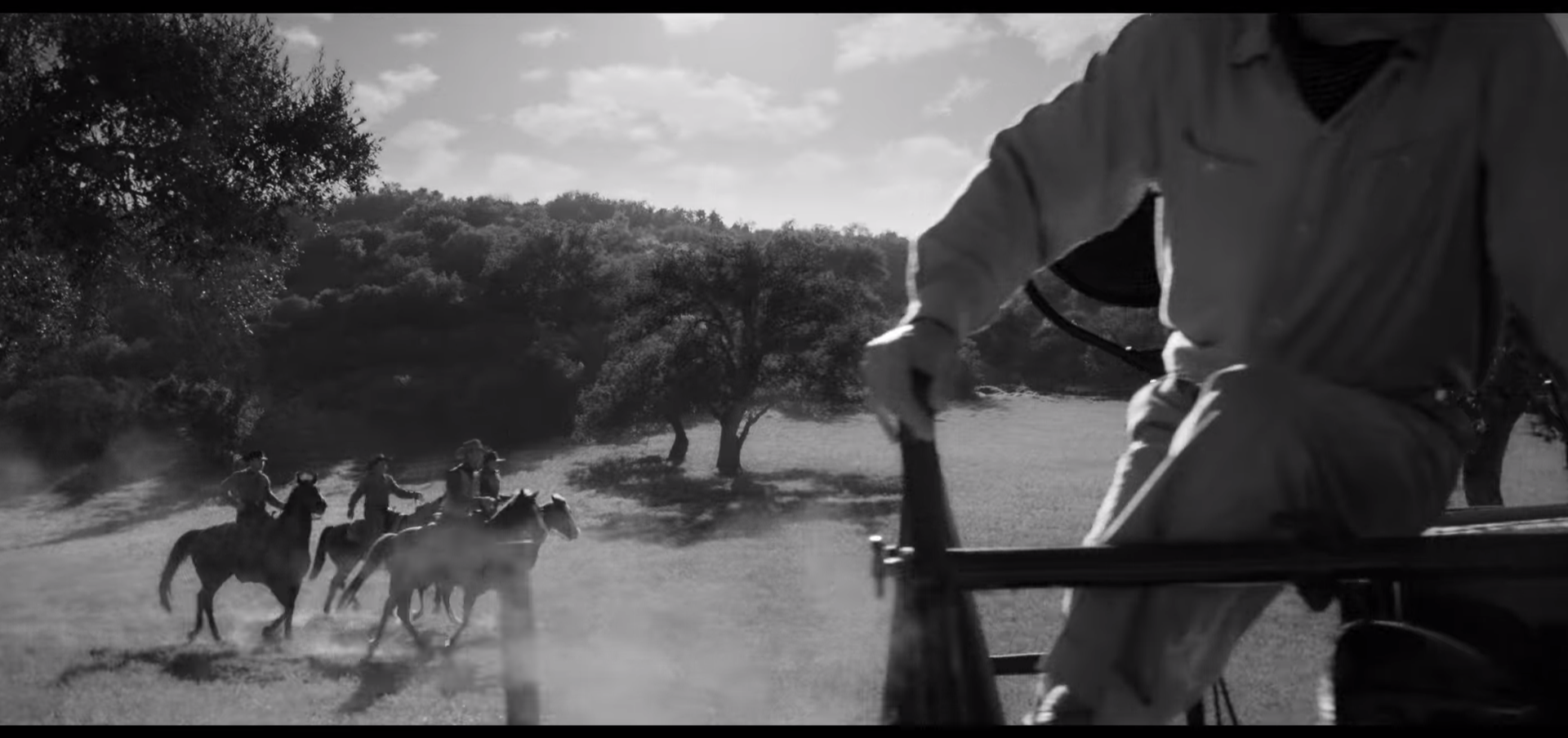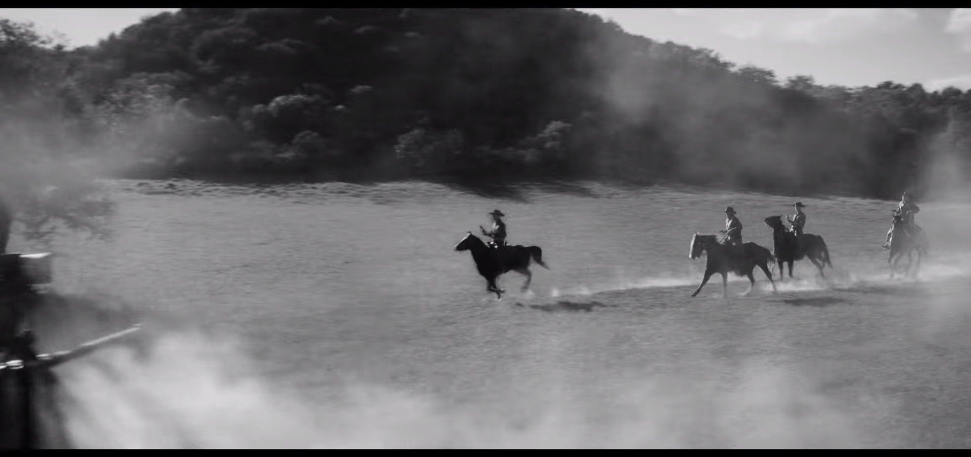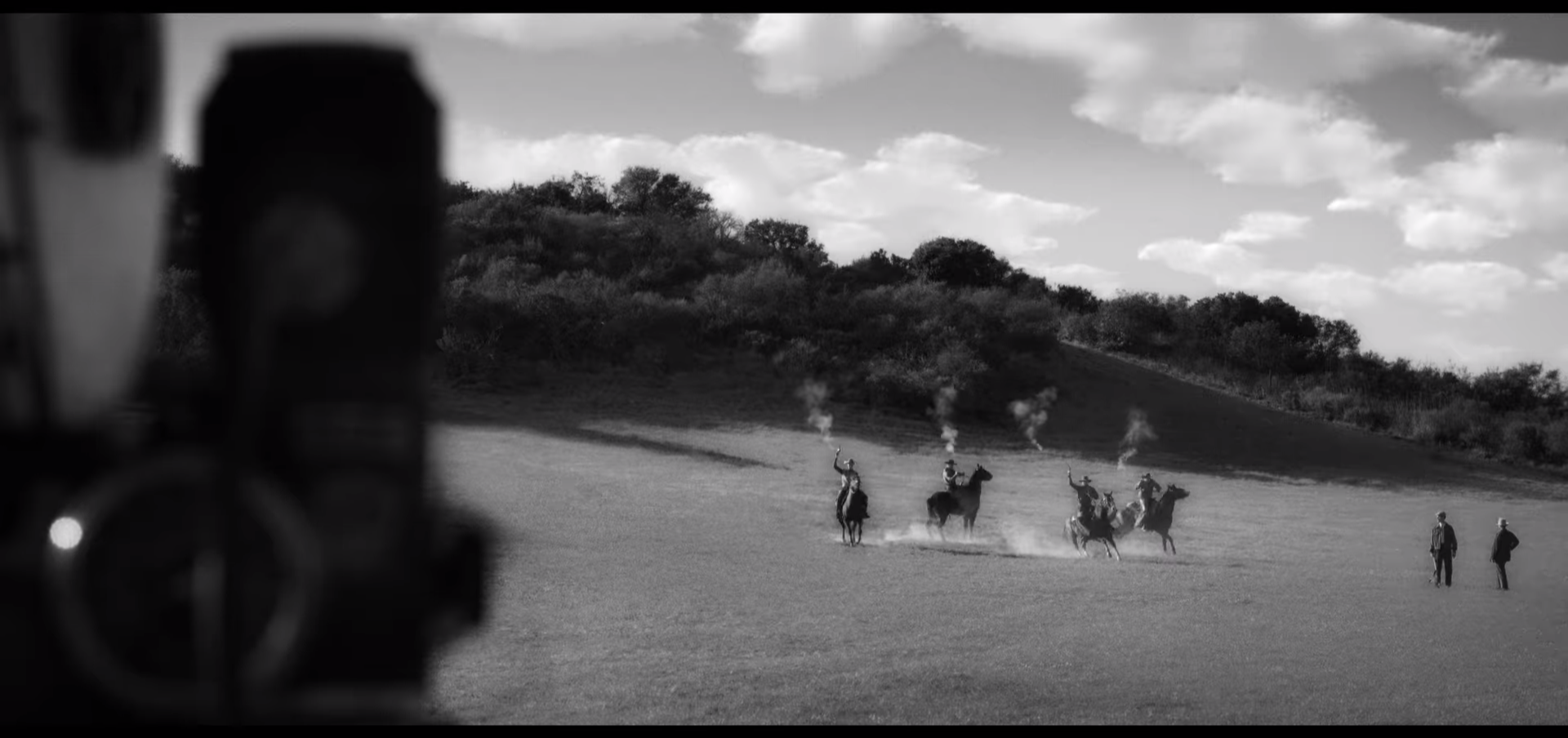 달려오는 말들과 비슷한 속도로 우측으로 트래킹+틸트다운+좌패닝이 동시다발적으로 이루어지는 크레인샷