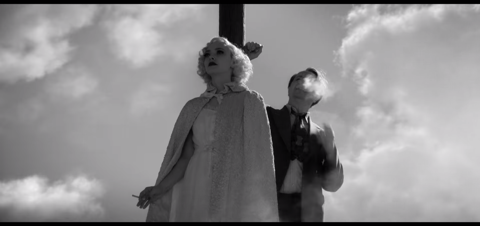 대사를 치는 마리온 뒤로 담배를 피며 서있는 맹크가 마치 악당이 된 것처럼 보이는 재밌는 이미지의 샷.
