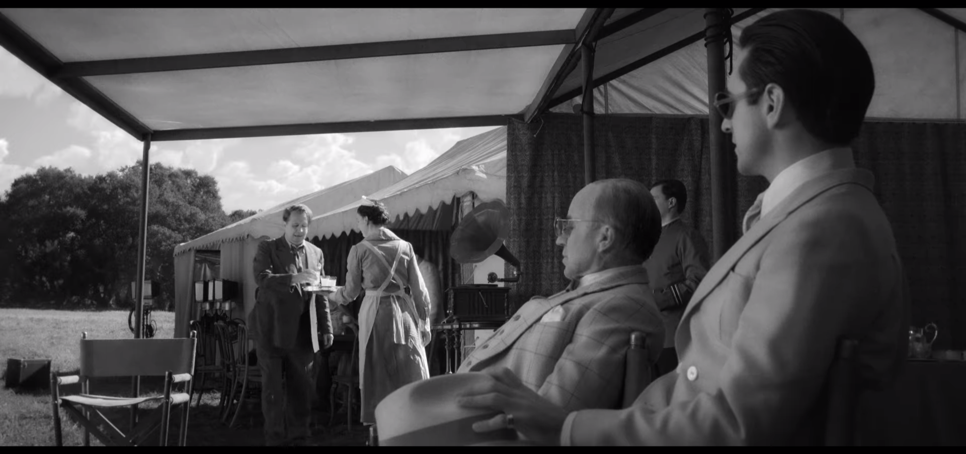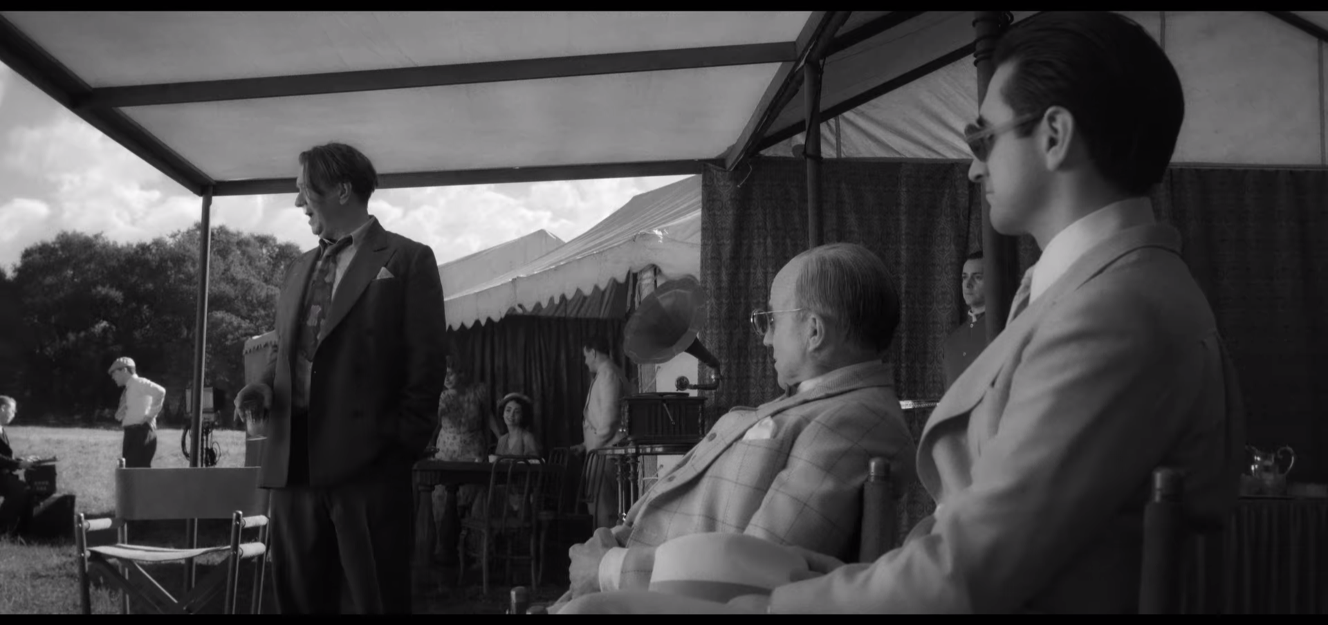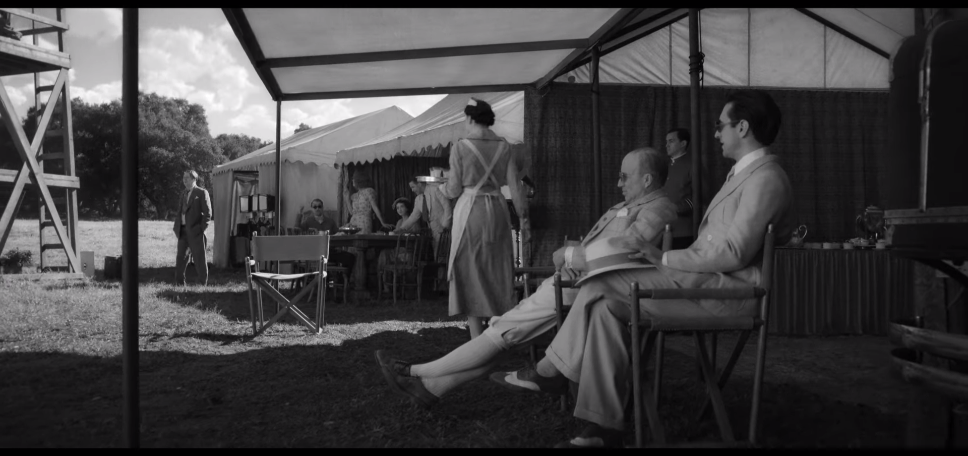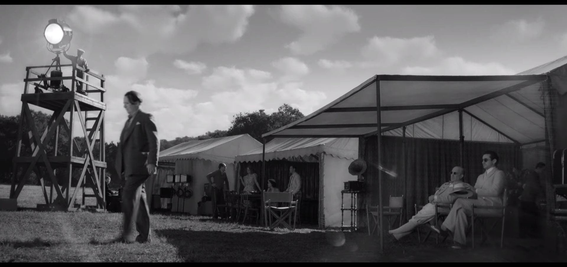 맹크가 천막 뒤에서 프레임 인 한다. 바쁘게 움직이는 사람들 사이 볕에 있는 까만 옷의 맹크와 응달에 있는 밝은 옷의 메이어&솔버그가 눈에 띄는 것은 시각적으로 탁월한 선택 같다.