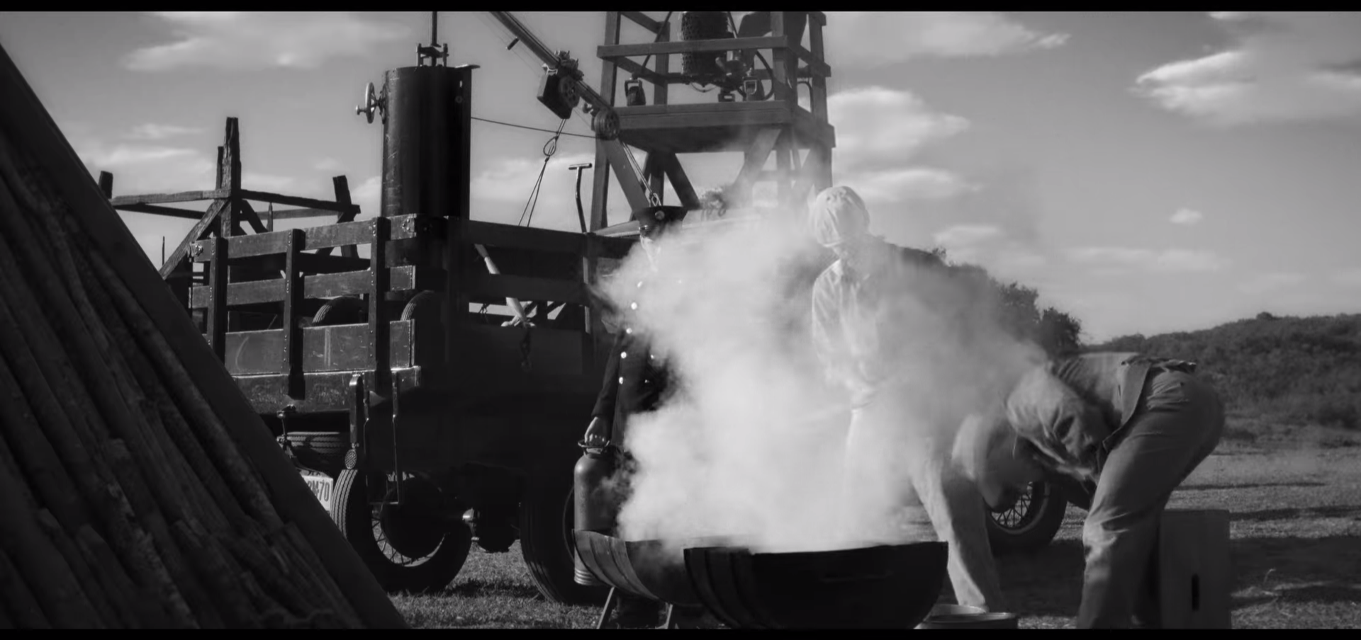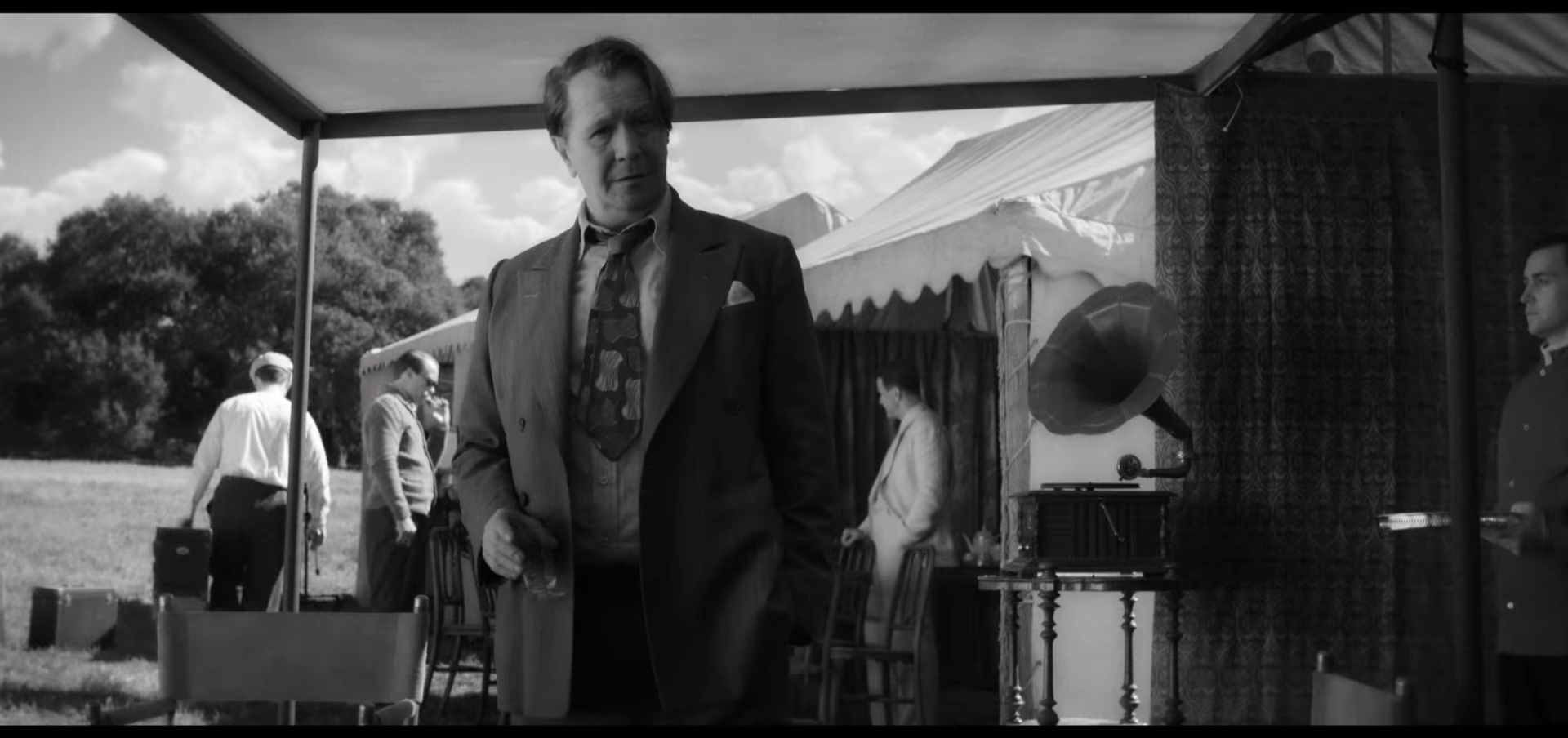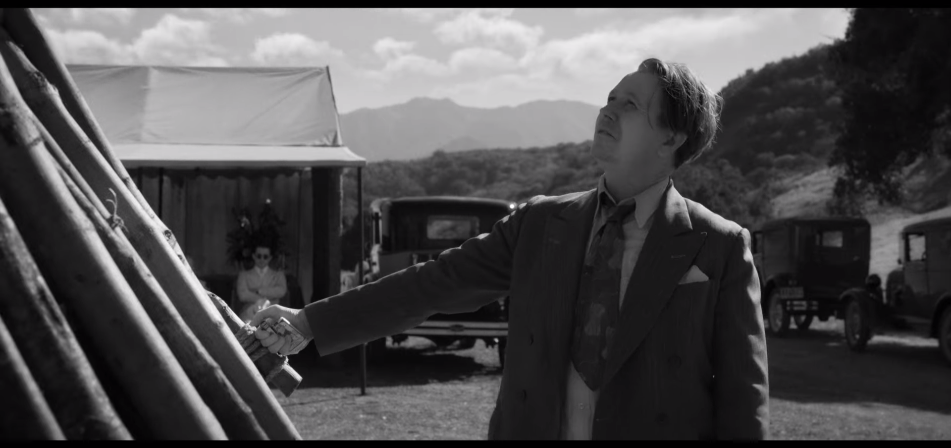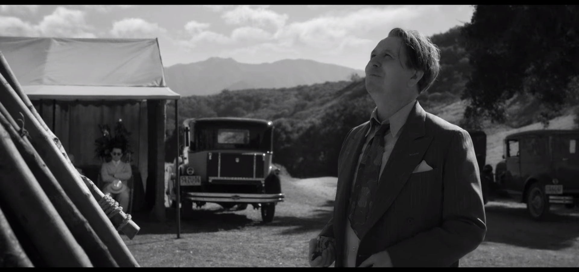 맹크가 천막 뒤에서 프레임 인 한다. 바쁘게 움직이는 사람들 사이 볕에 있는 까만 옷의 맹크와 응달에 있는 밝은 옷의 메이어&솔버그가 눈에 띄는 것은 시각적으로 탁월한 선택 같다.